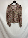 Blusa beige con flroes burdeos semitransparente.