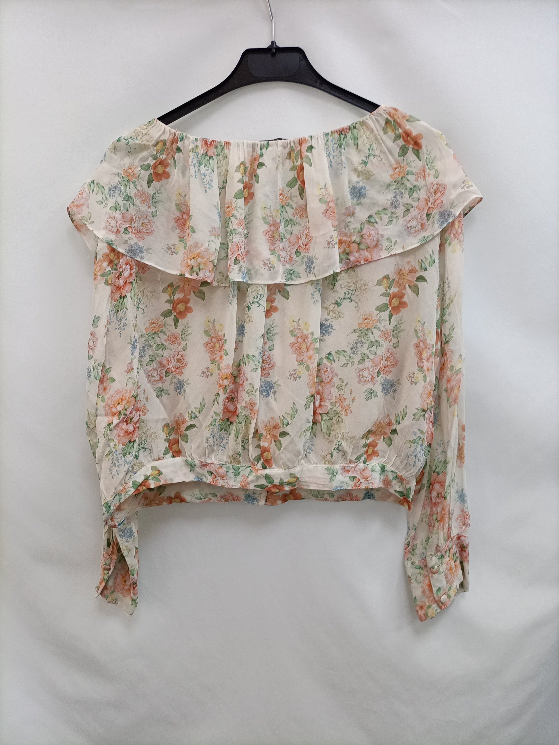 Blusa beige fluida estampado flores, volantes. De sisa a sisa 55 cm largo 41 cm. Forro interior, no se transparenta