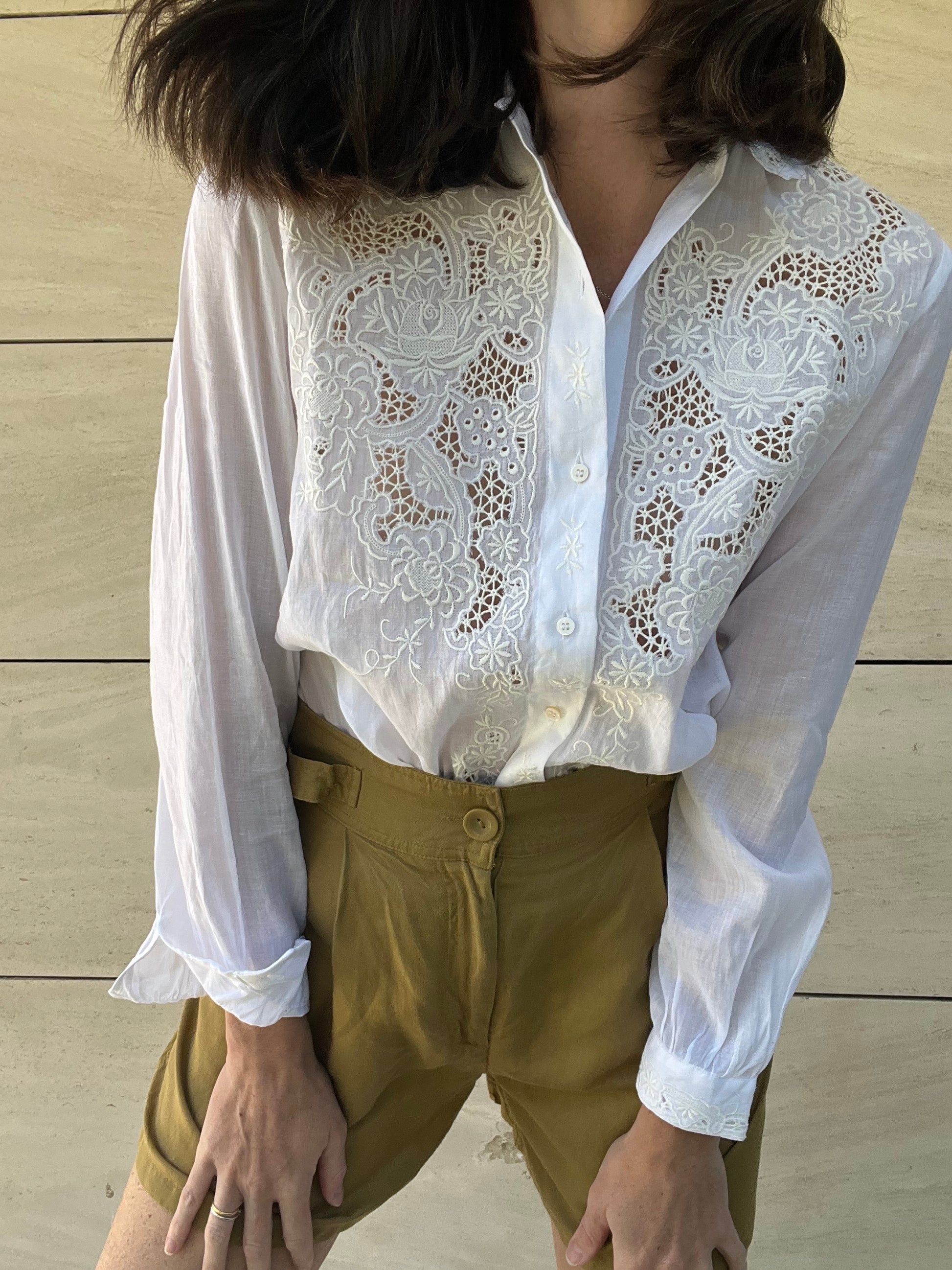 blusa bordada y detalles troquelado. De sisa a sisa 52 cm, largo 63 cm.