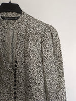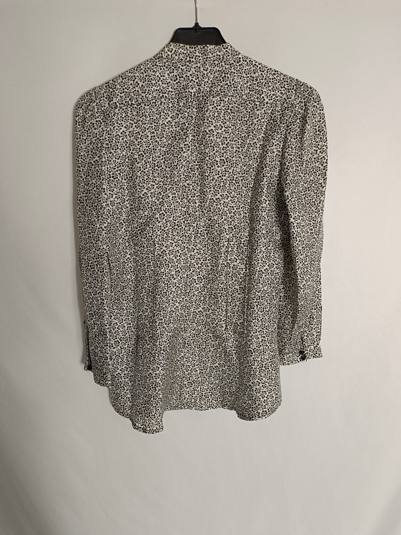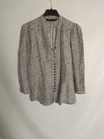 blusa blanca entallada con florecitas negras abotonada