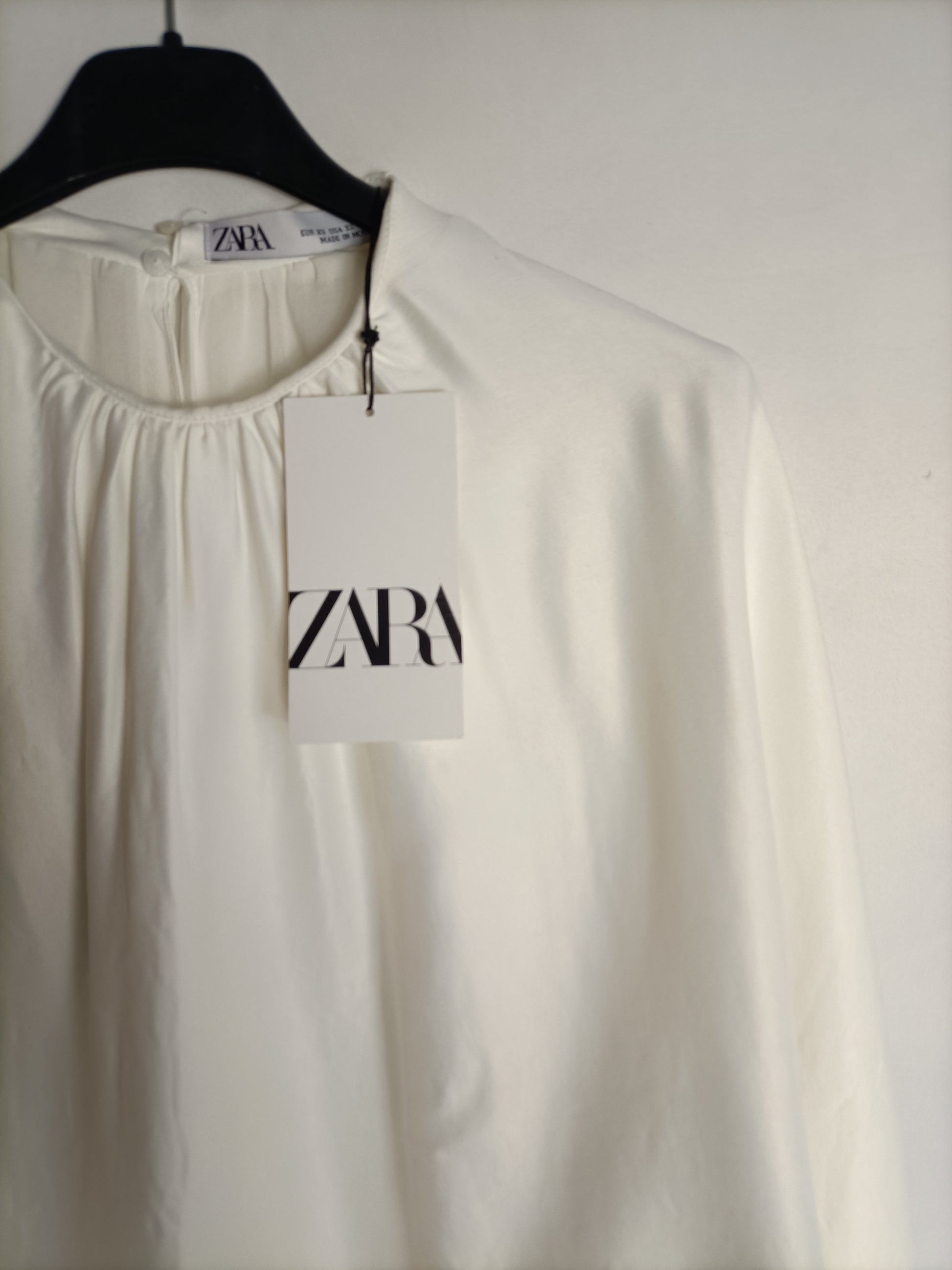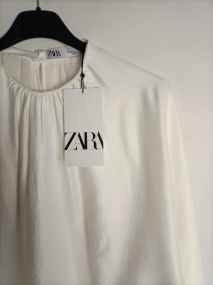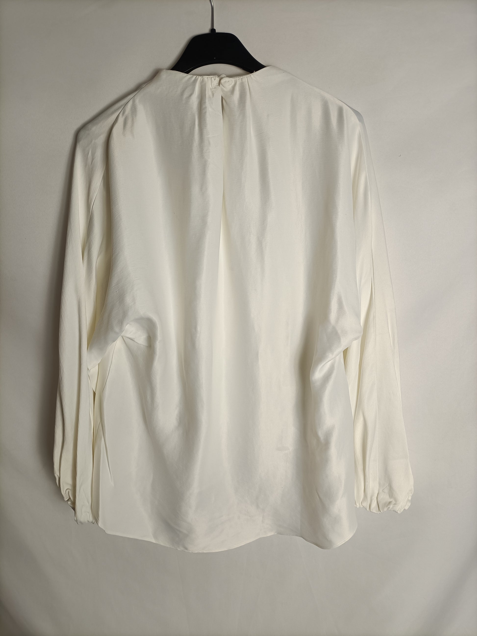 NUEVO CON ETIQUETA. Blusa blanca con el cuello fruncido de tejido tipo raso