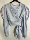 Blusa corta cruzada azul claro. Detalle manga. Tejido no elástico
