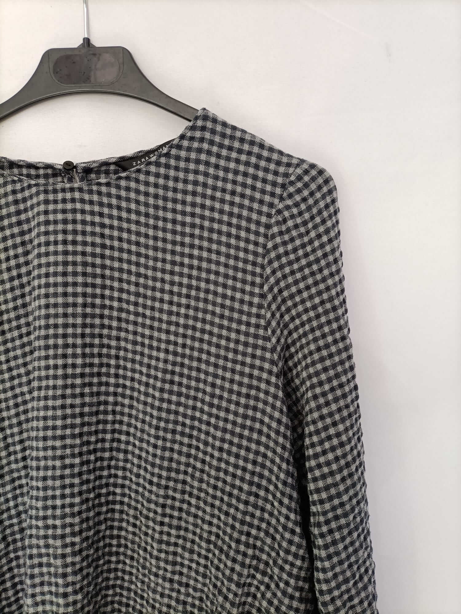 Zara. S. Blusa de cuadros gris y negro con volantes laterales. Tejido arrugado. De sisa a sisa 56 cm largo 66 clv