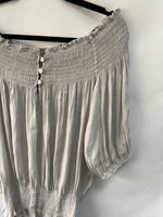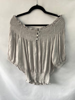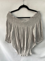 Blusa gris con cuello barco elástico de nido de abeja, ajustada a la cintura con elástico y manga 3/4. De sisa a sisa 50 cm, largo 52 cm
