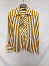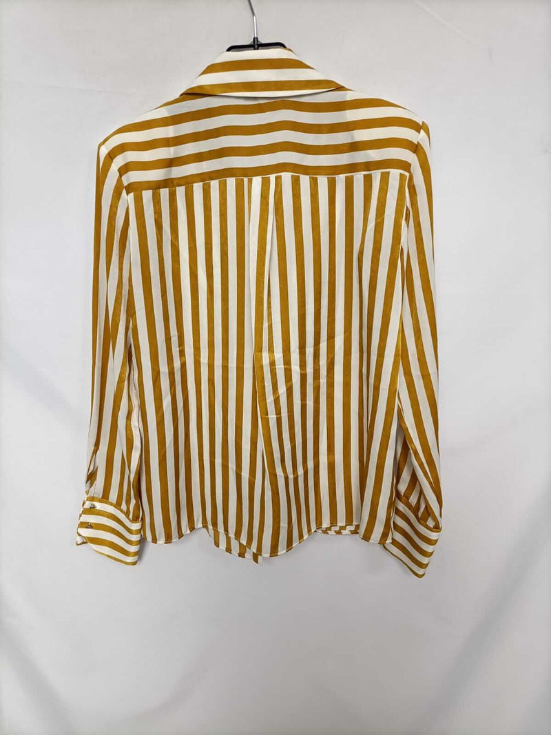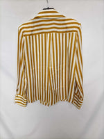 Zara. Xs. Blusa de rayas mostaza y blanco con volante en la parte delantera. Tejido tipo seda. Tiene hombreras. No es elástica. De sisa a sisa 51 cm largo 64 cm