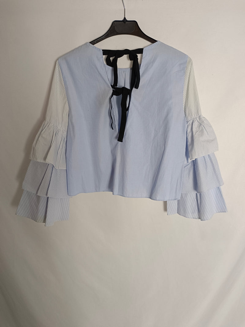 blusa cortita azul con las mangas de volantes con cuadros y rayas