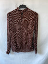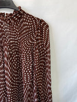Blusa fluida marrón con cuadraditos blancos. Escote fruncido y semitransparente. De sisa a sisa 48 cm largo 59 cm