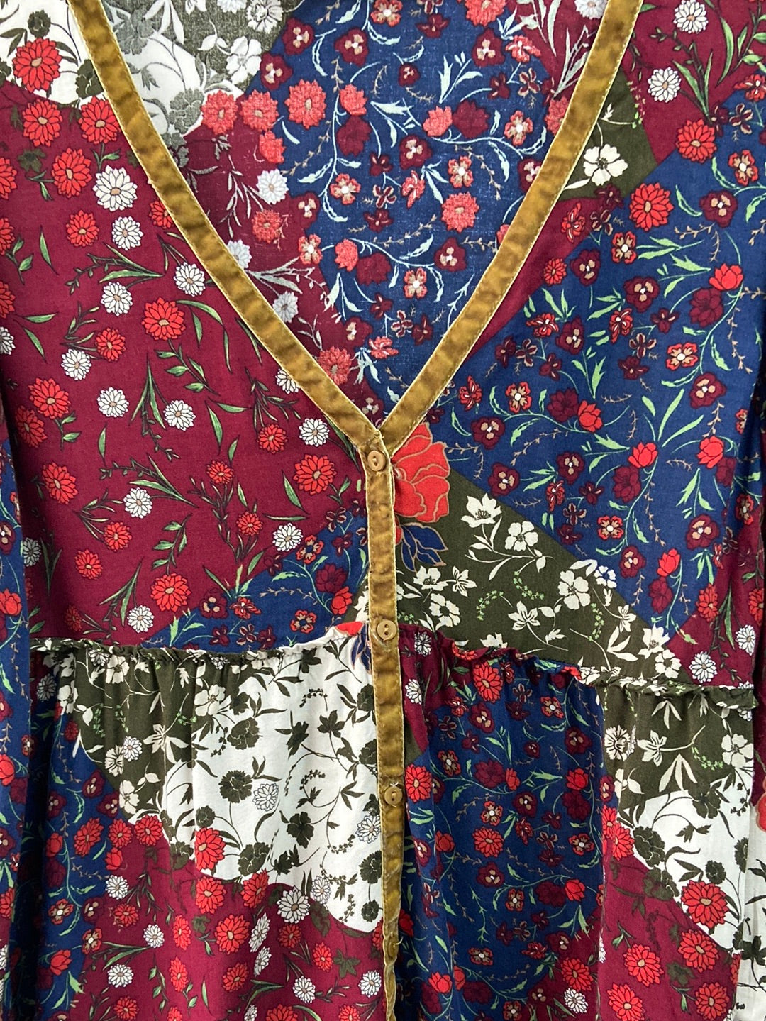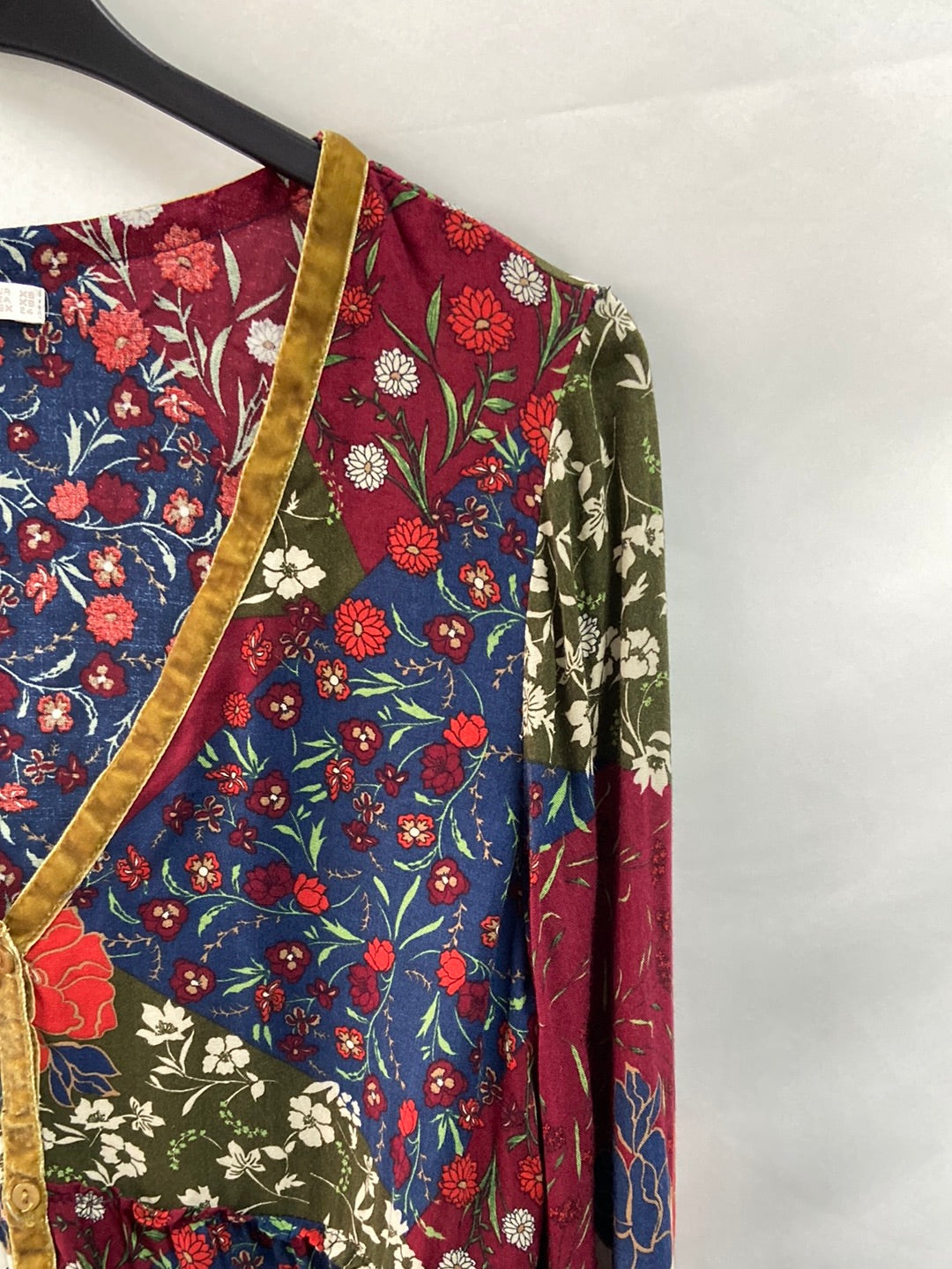 Blusa multiestampado de flores en diferentes tonos. Estilo hippie-chic. Manga larga. Abotonada como corte y volante .