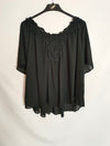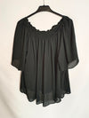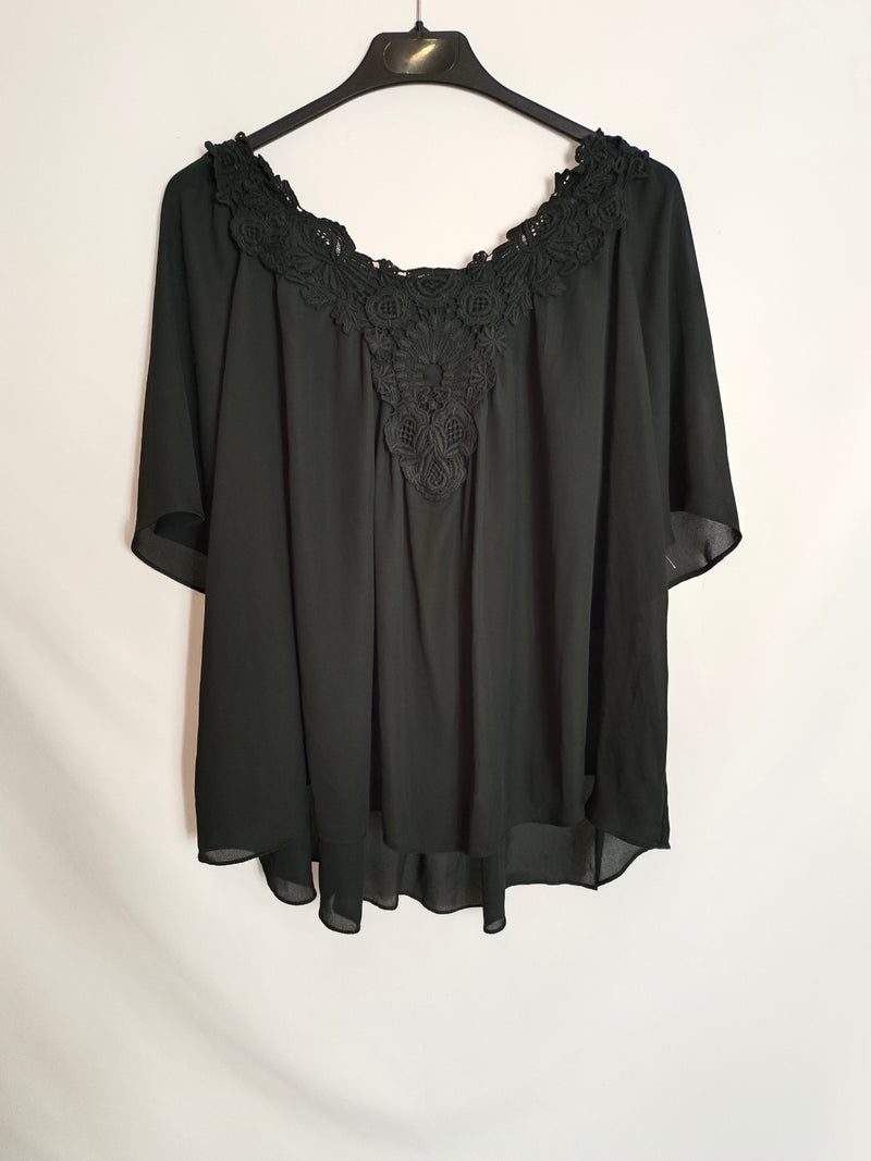 blusa negra fluida semitransparente con detalle de encaje en el cuello