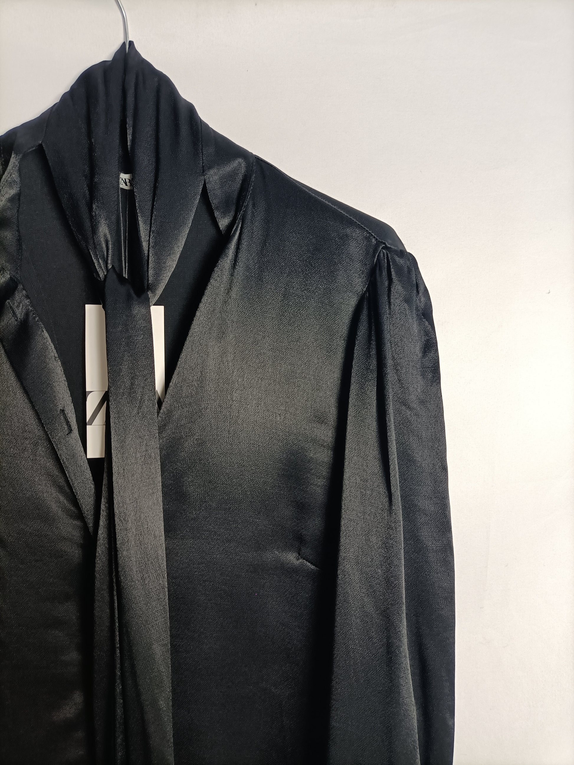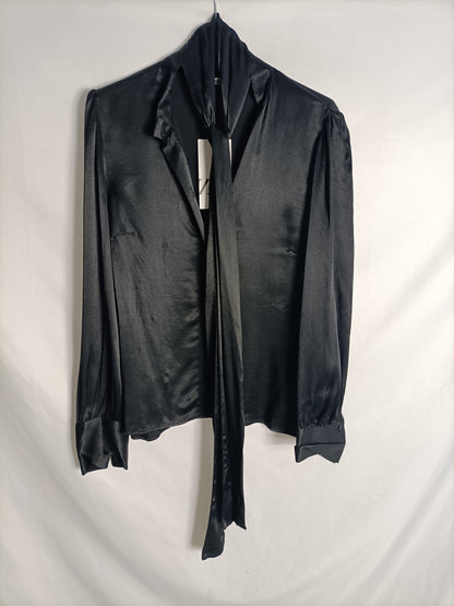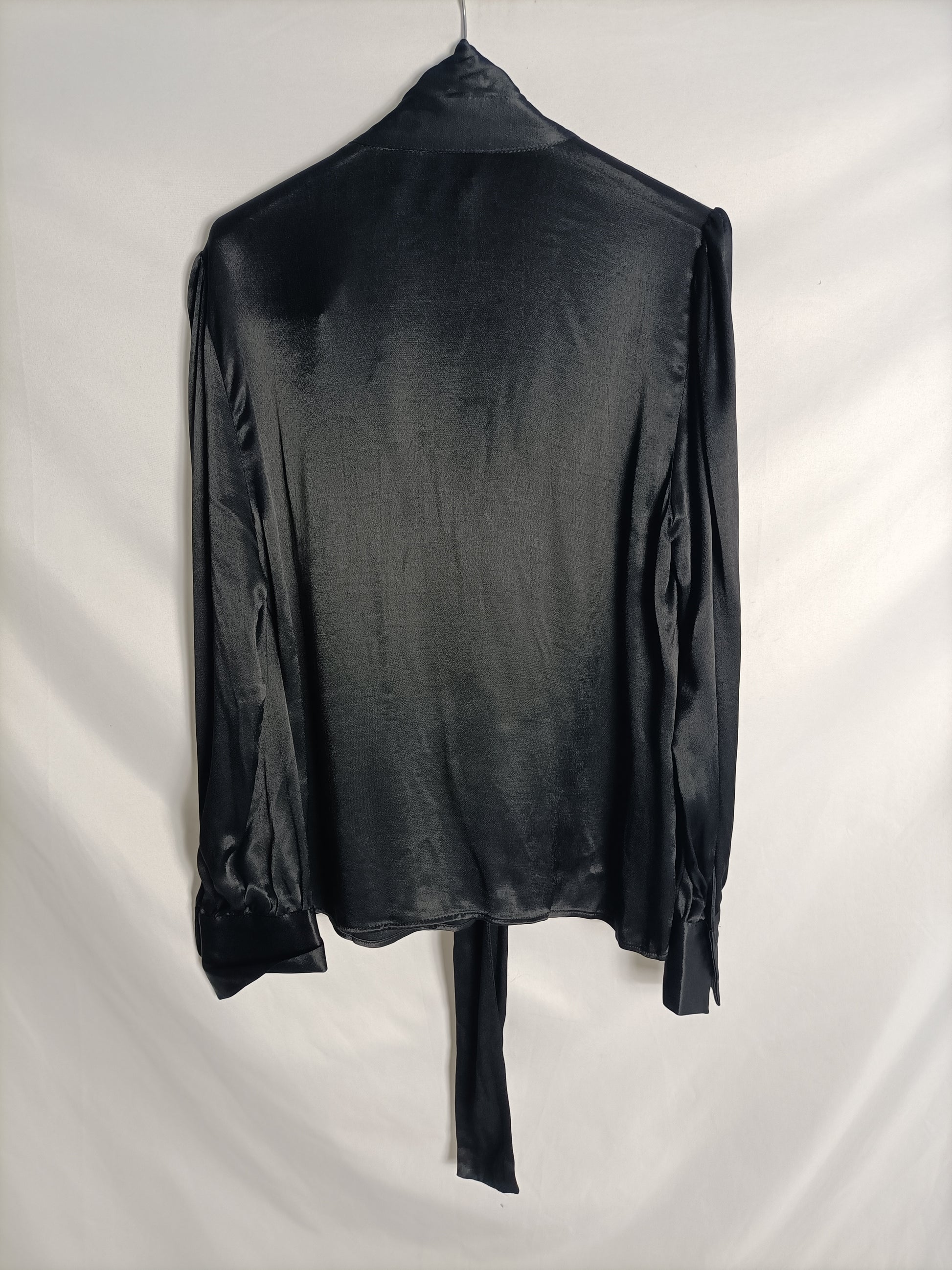 NUEVO CON ETIQUETA. blusa fluida negra de tejido satinado con lazada en el cuello