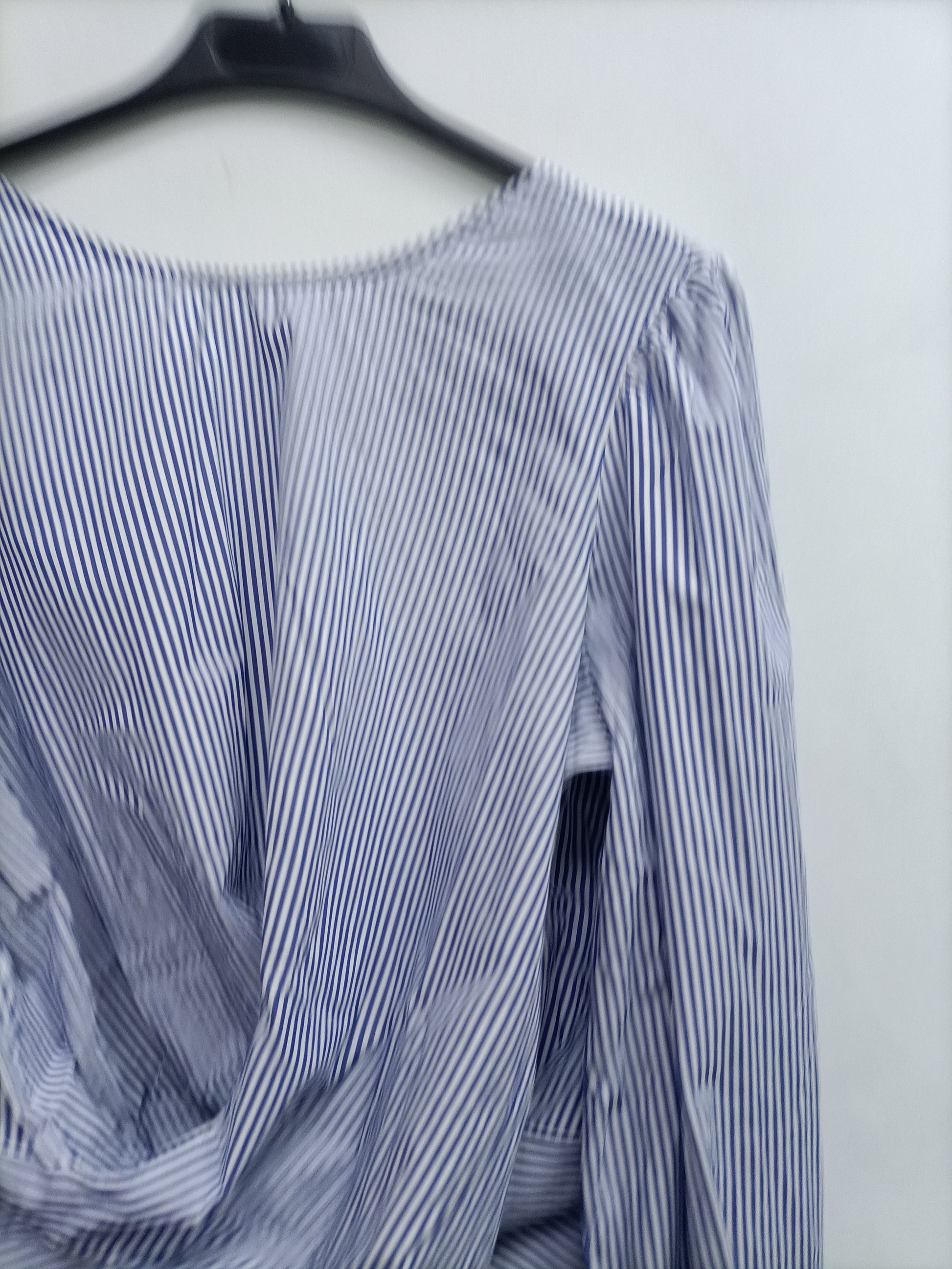 Blusa de rayas azul y blanca cruzada con espalda abierta.
