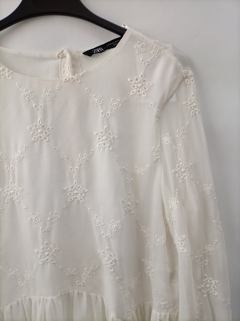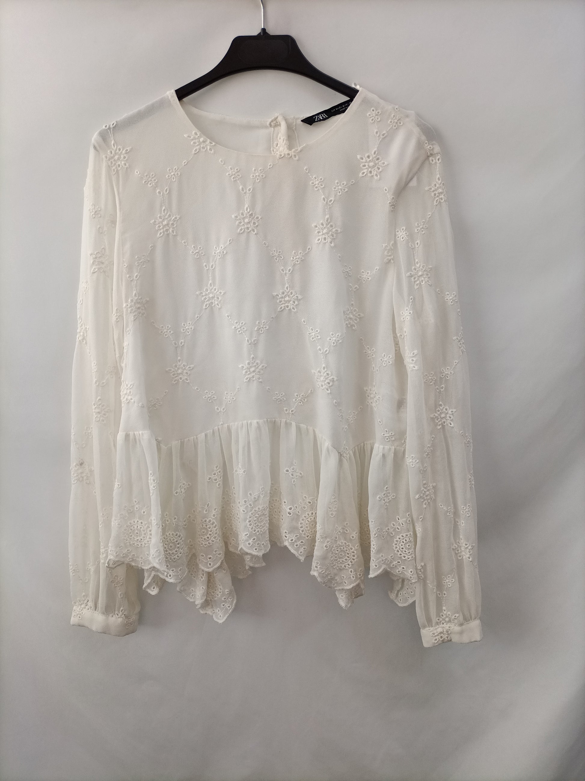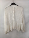 Blusa beige de encaje abotonada por la espalda. Semitransparente, no es elástica. De sisa a sisa 44 cm largo 58 cm