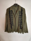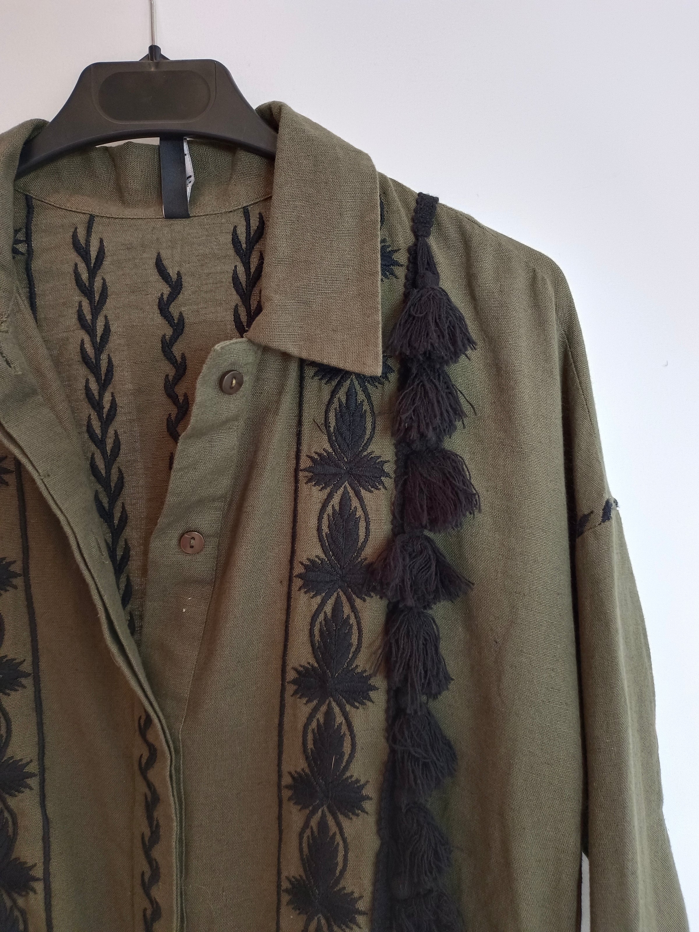 NUEVO CON ETIQUETA. blusa verde con detalles bordados y borlas de lino y algodón.