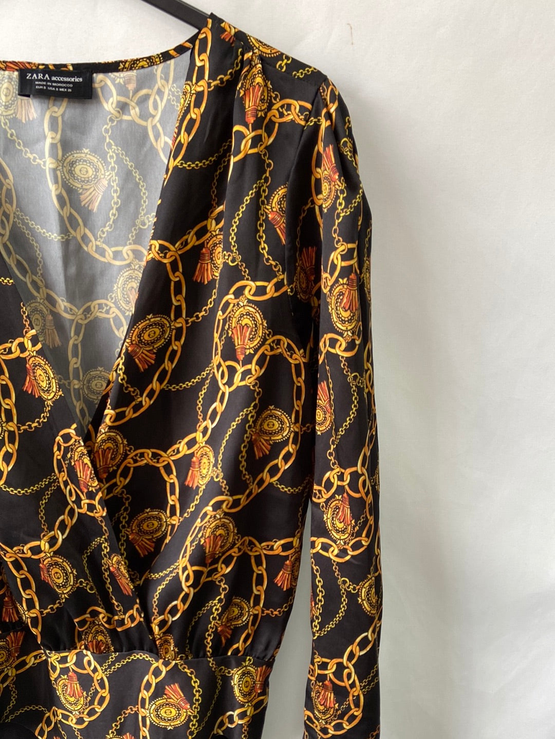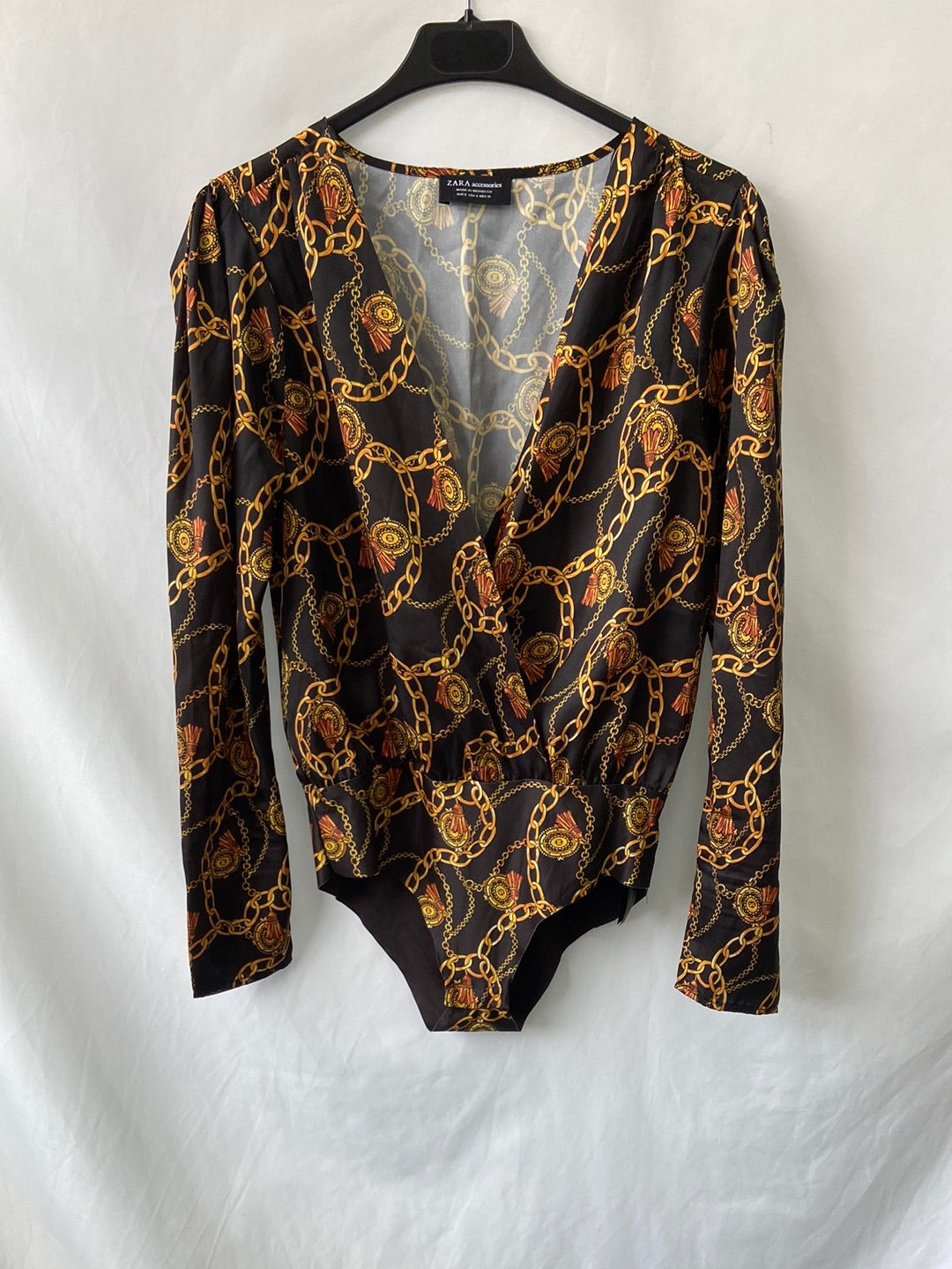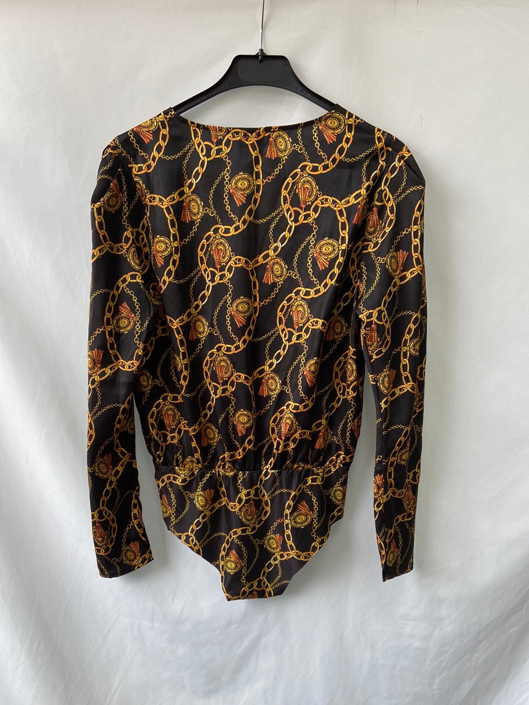 body fluido negro cadenas no elástico escote cruzado. De sisa a sisa 42 cm largo 71 cm.