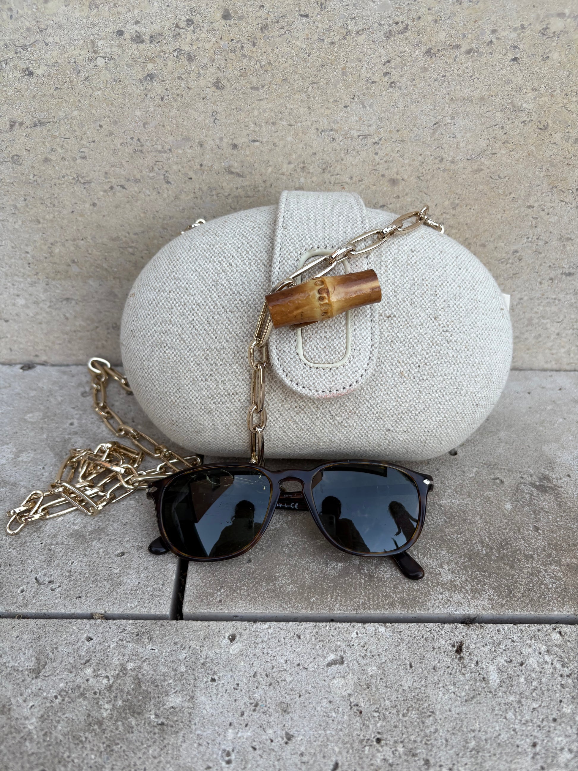 Bolso rígido tela beige jaspeada. Ancho 21 cm , alto 16 cm