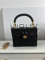 Bolso negro mimbre pequeño. Doble asa, una rigida y otra cadena dorada