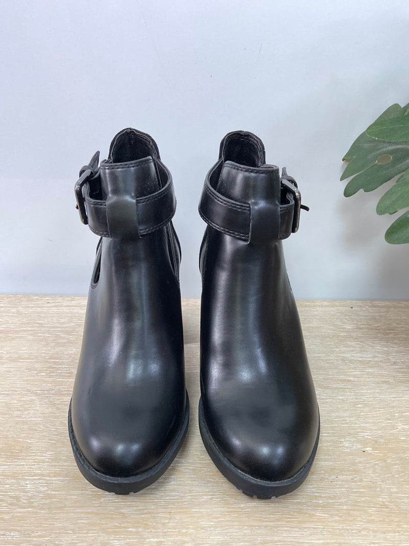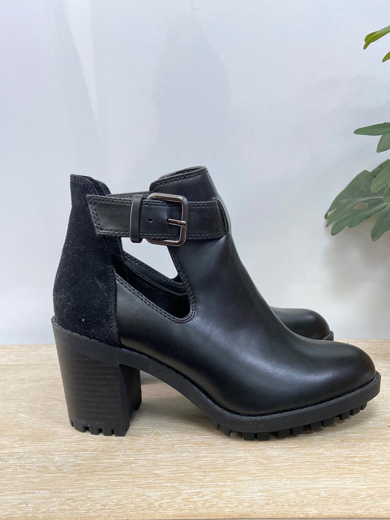 Botines negros tobilleros con hebilla lateral y aperturas. Tacón 7 cm, plataforma 2 cm