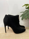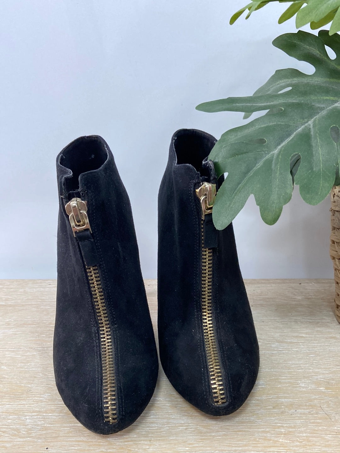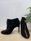 Botines negros de antelina con una cremallera dorada en la parte delantera y tacón de aguja