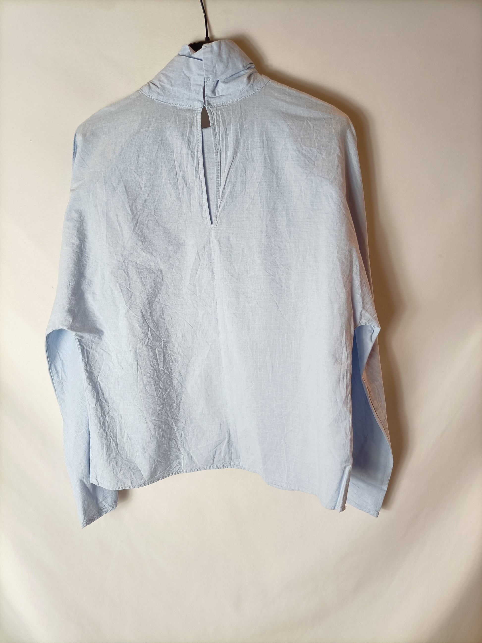 Blusa azul con el cuello perkins y las mangas estilo murciélago