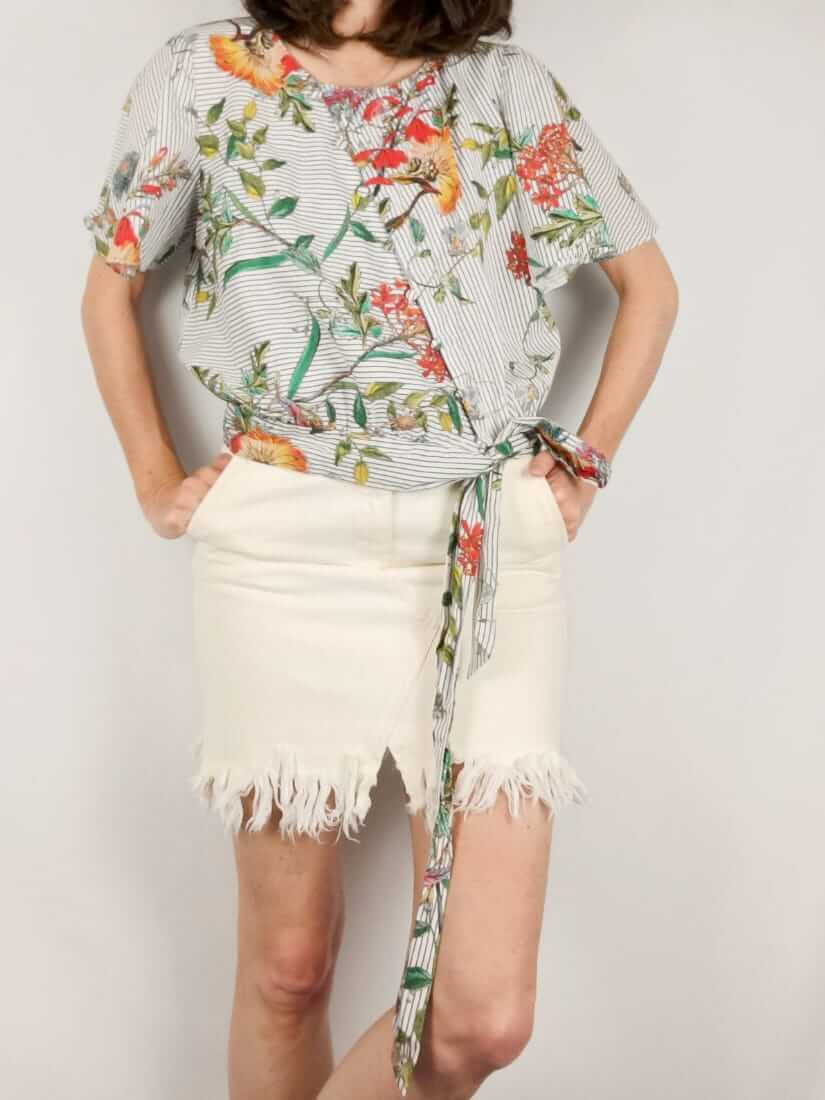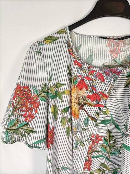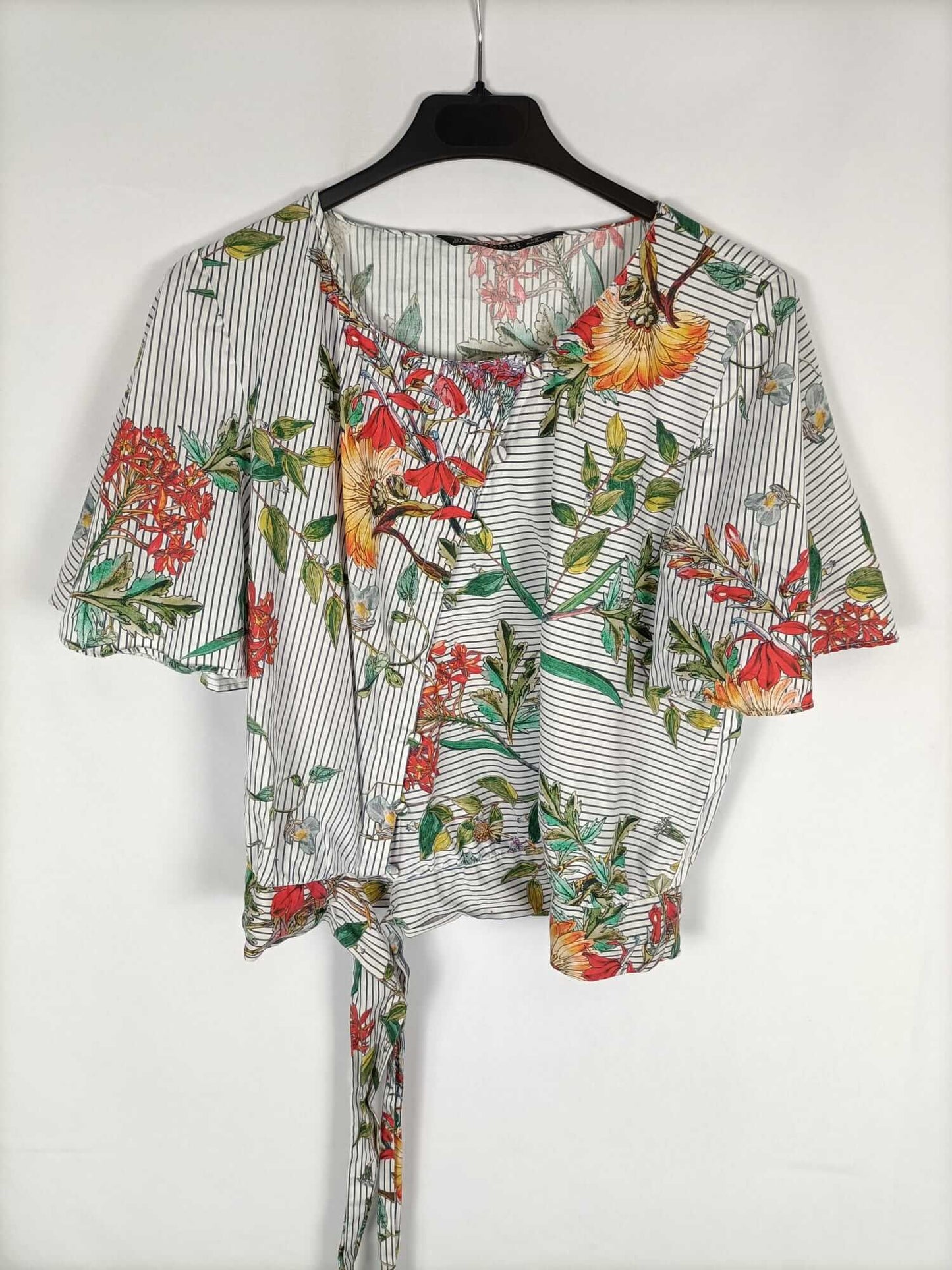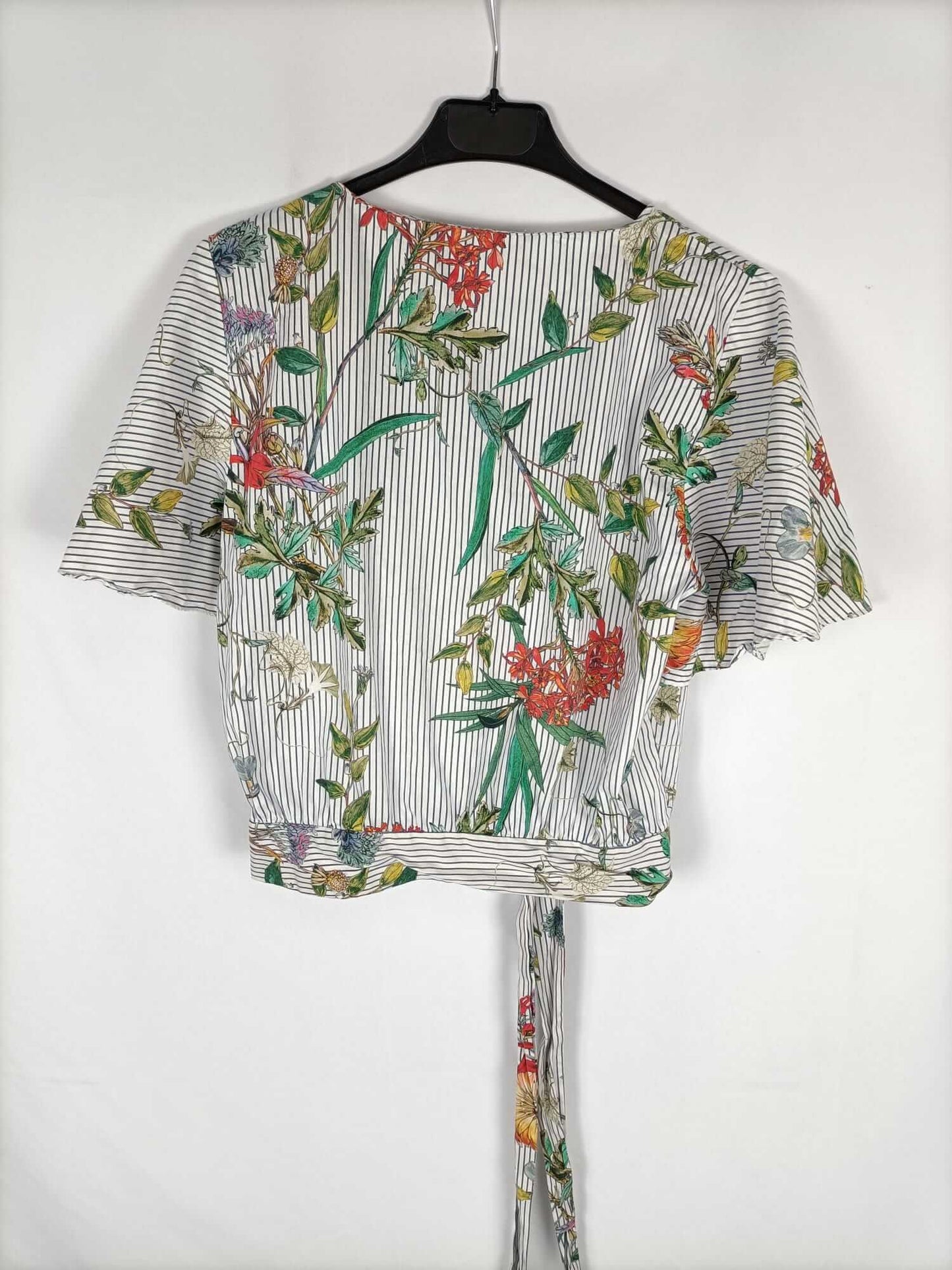 Camisa de rayas azules y blancas con estampado de flores, es cruzada con botones y lazada en la cintura. De sisa a sisa 50 cm, largo 54 cm