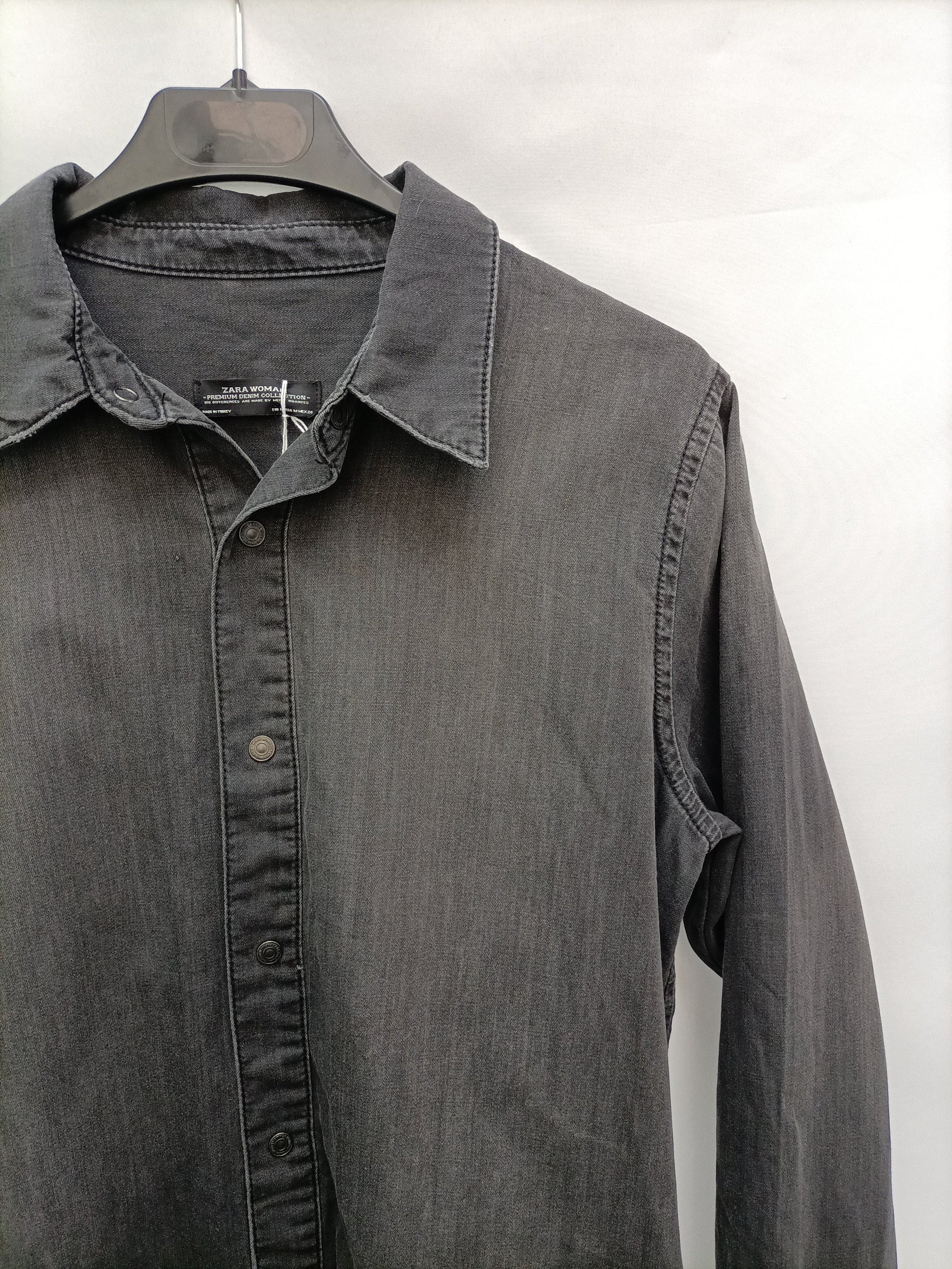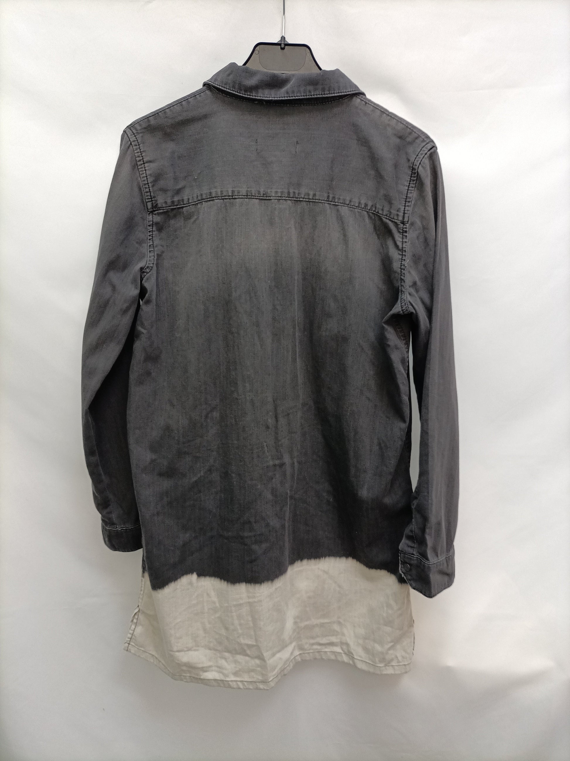 Camisa vaquera negra larga/vestido corto con la parte de abajo gris, se abrocha con botones de clip. No elástica. De sisa a sisa 50 cm largo 86 cm