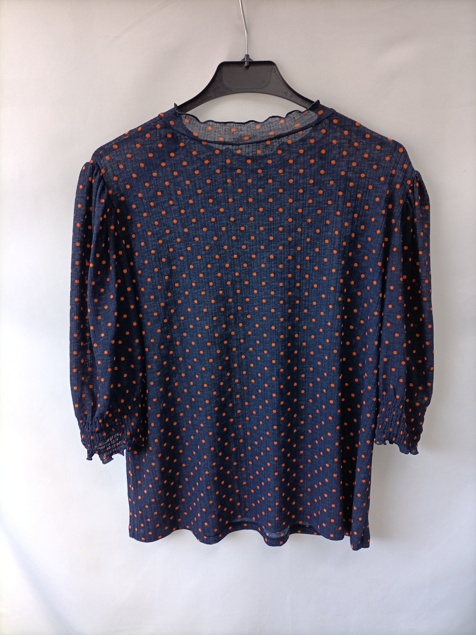 camiseta azul con lunares naranjas, tejido rugoso con mangas abombadas y cuello fruncido. Largo 55 cm