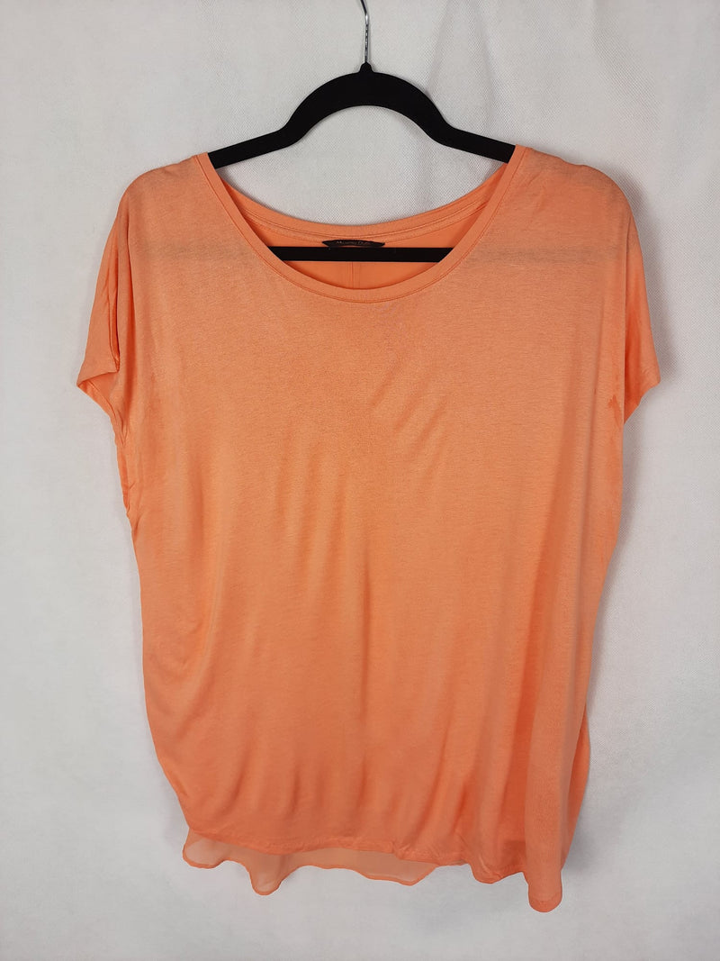 Camiseta naranja fluida y elástica con la espalda abierta con tela de gasa.