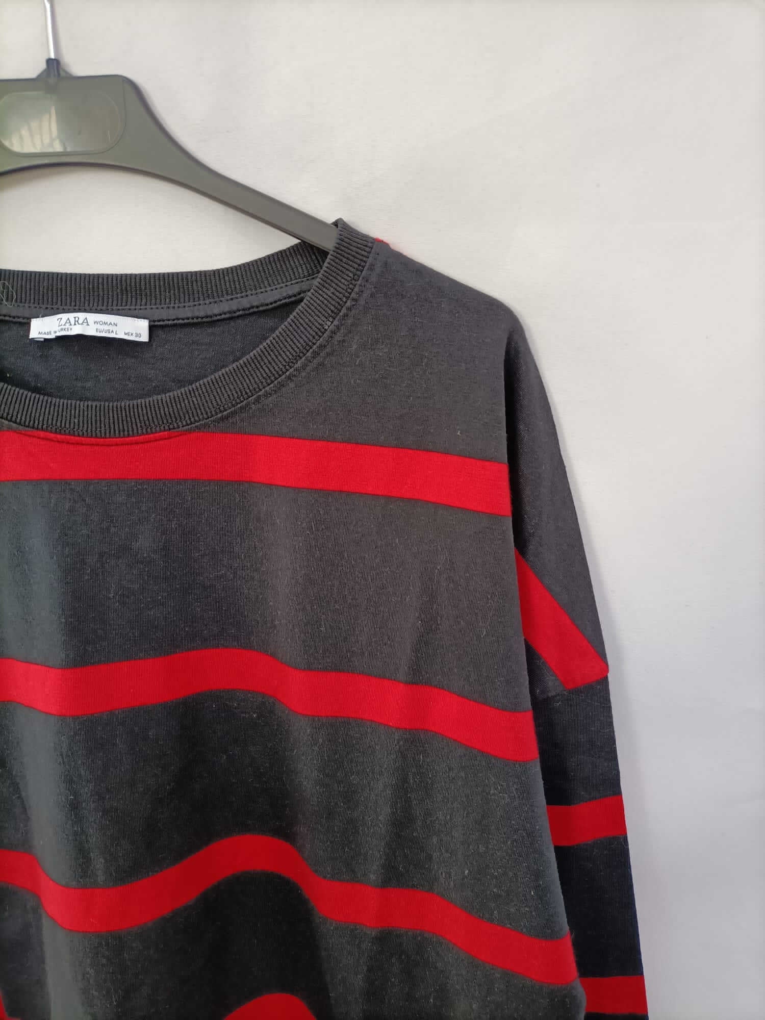 Zara. L. Camiseta/sudadera negra con rayas rojas. Fluida y finita. Largo 64 cm