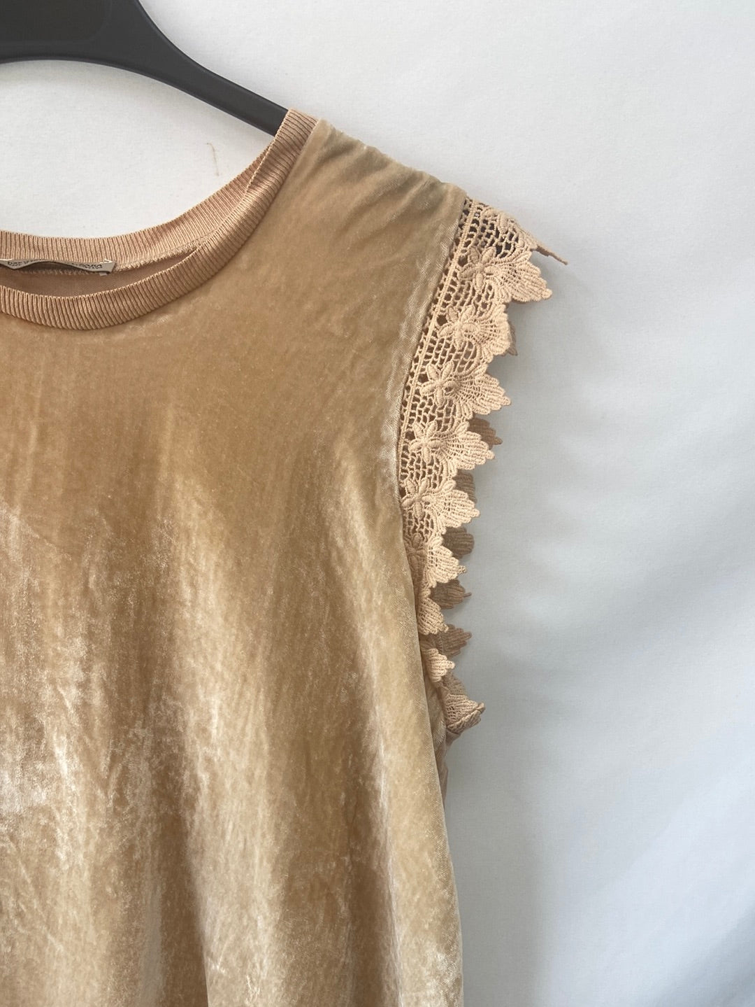 Doble textura por delante de terciopelo y por detrás tipo camiseta. Detalles de croché en las mangas. Elástica. Largo 62 cm.
