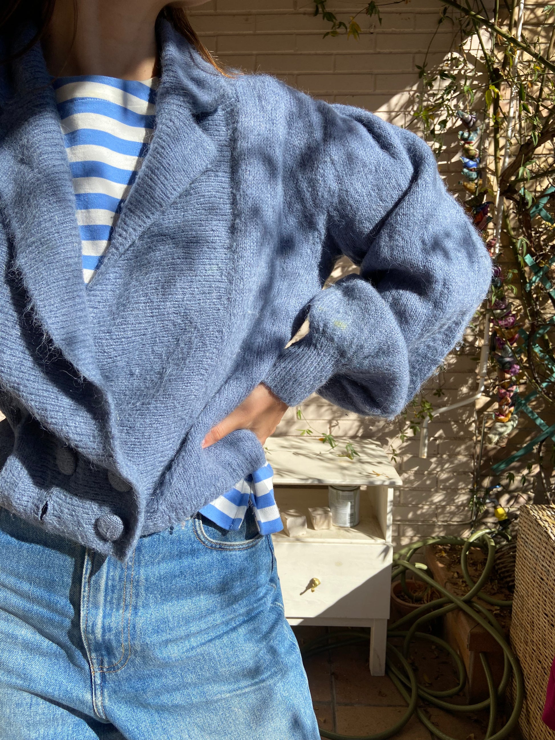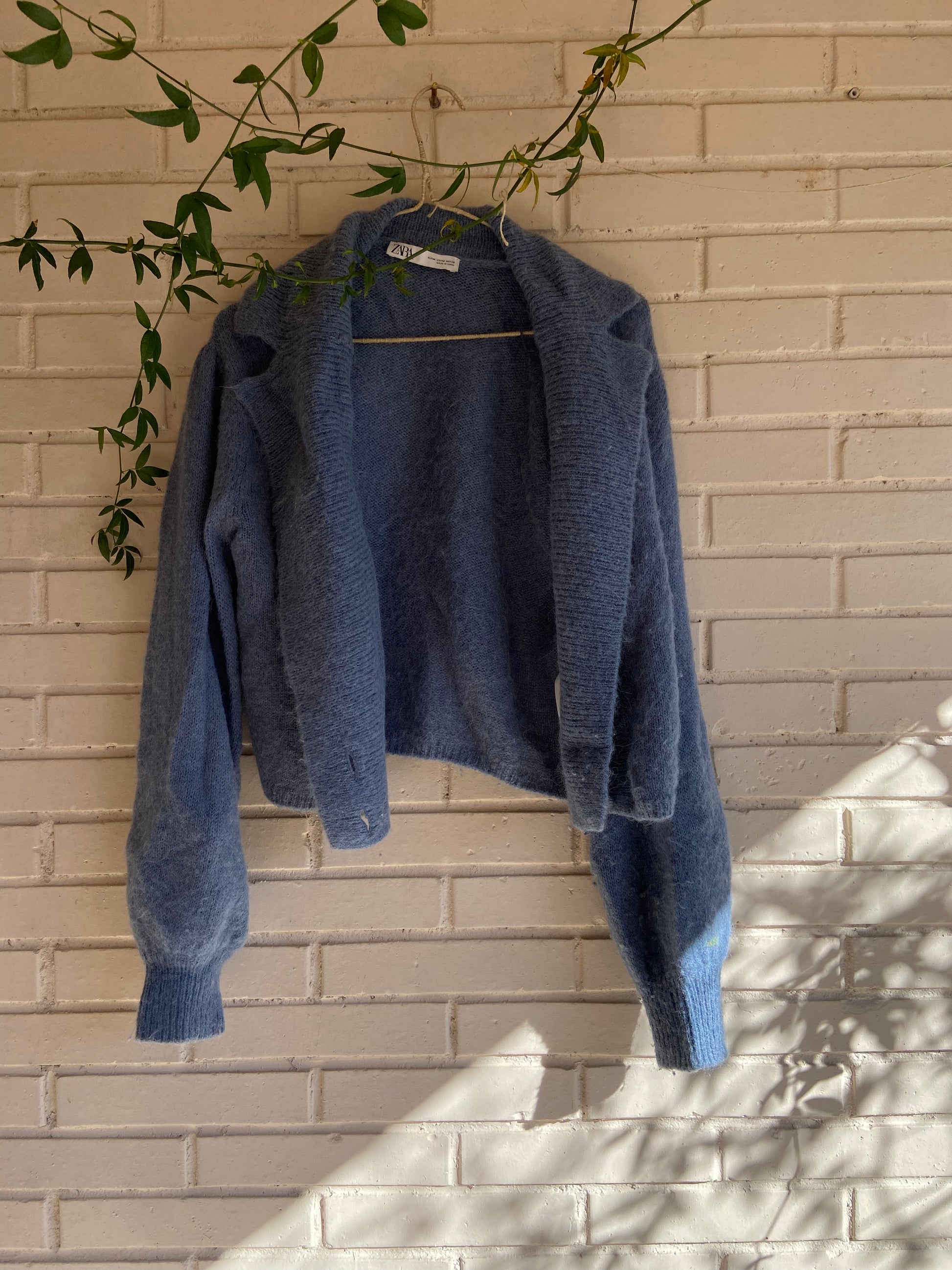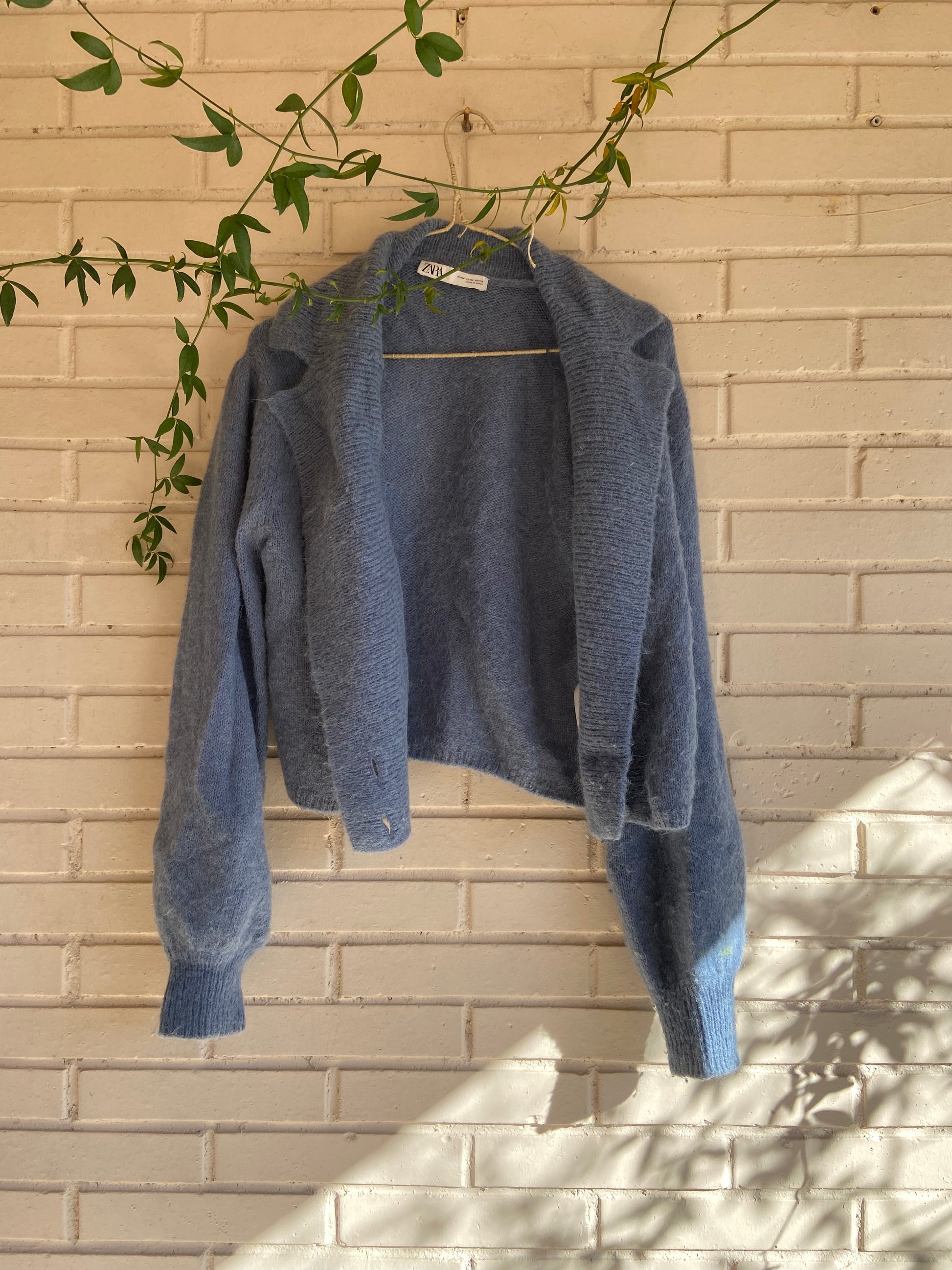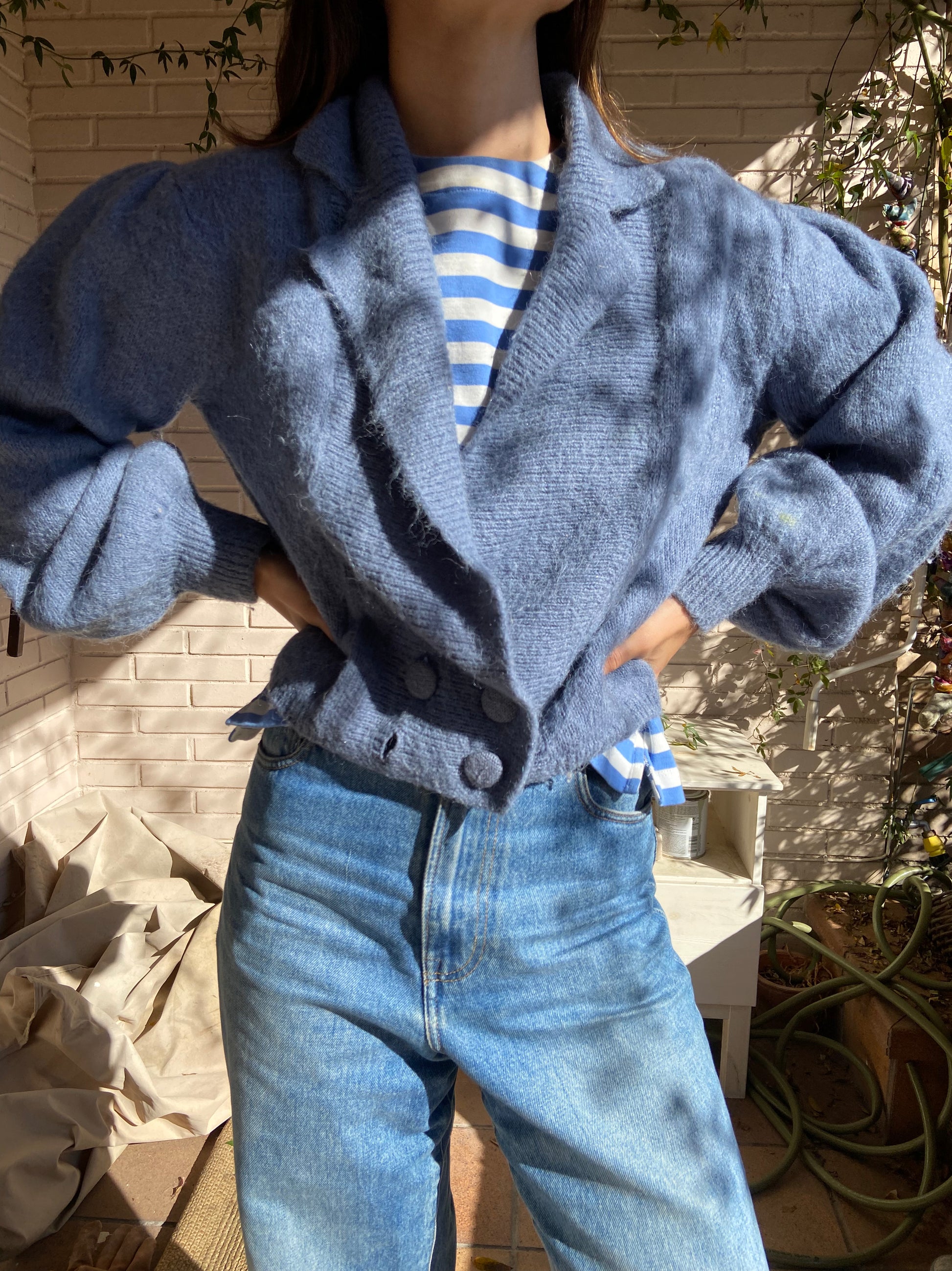 cárdigan azul cortito cruzado con las mangas abullonadas.