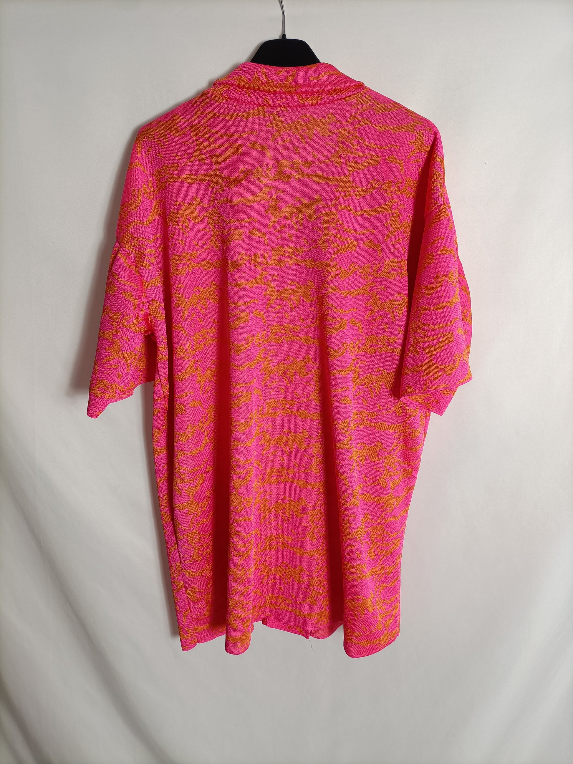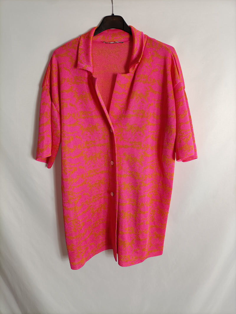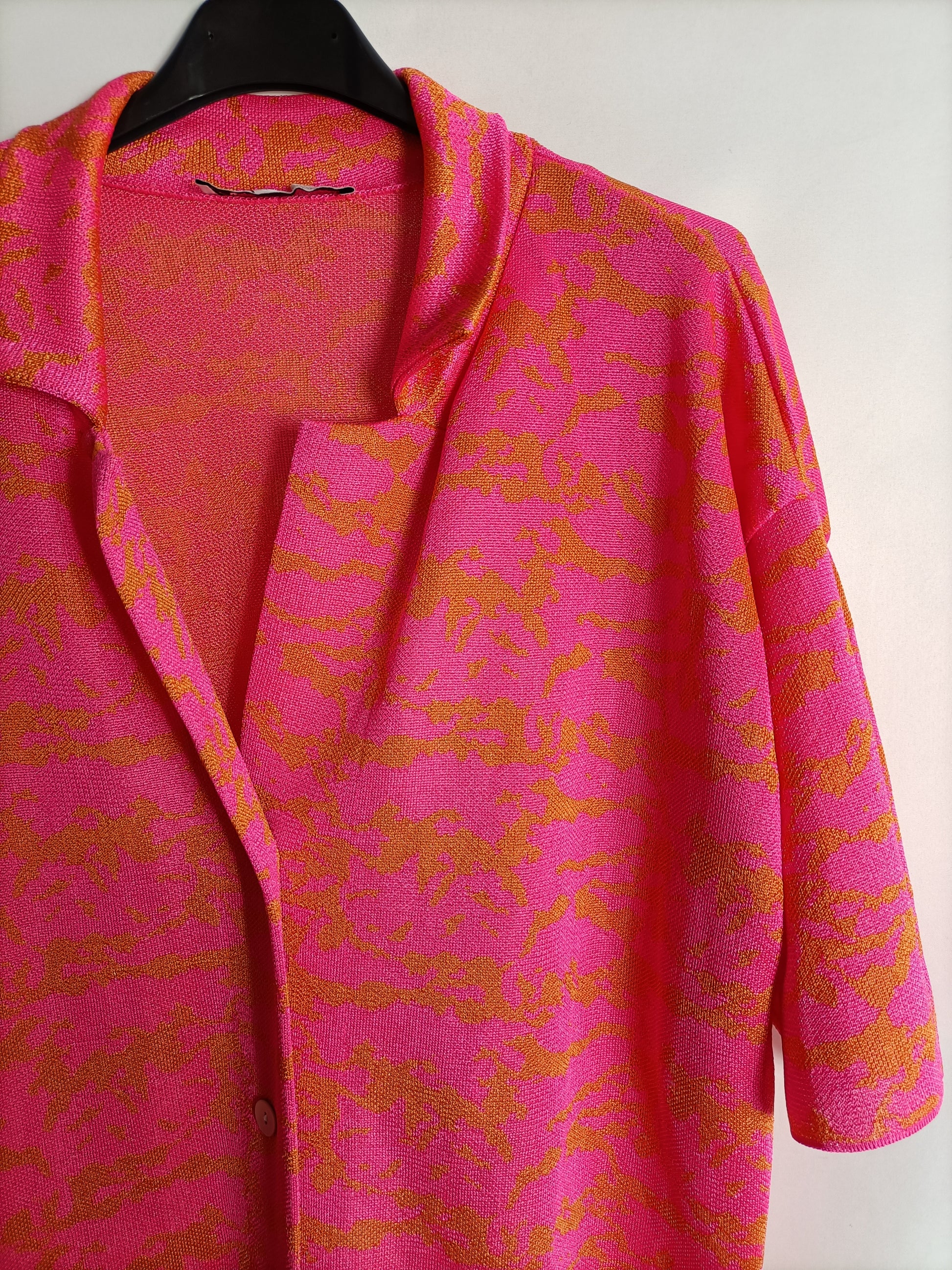 cárdigan fino de punto rosa fucsia con flores naranjas. Fluido y elástico.