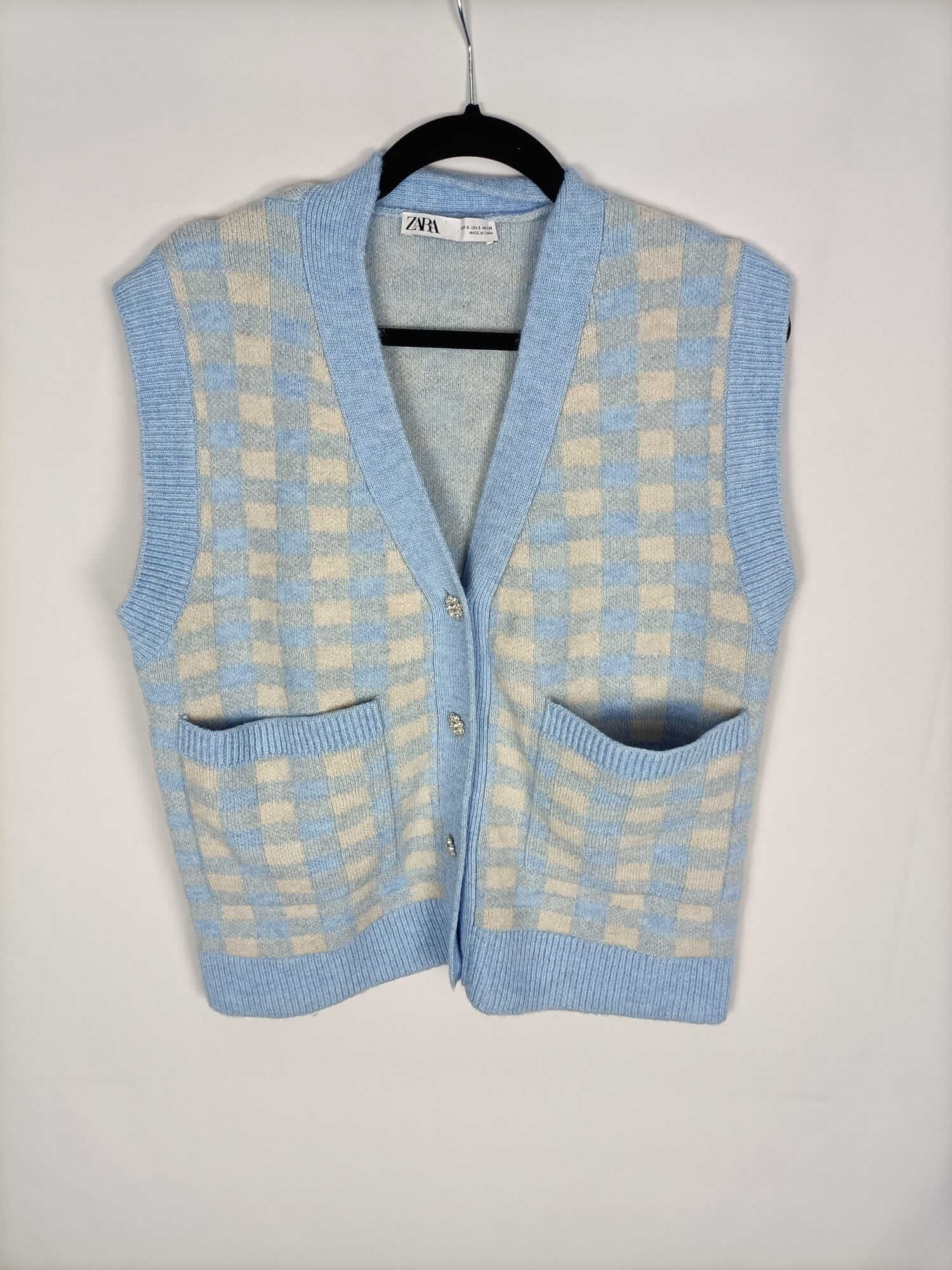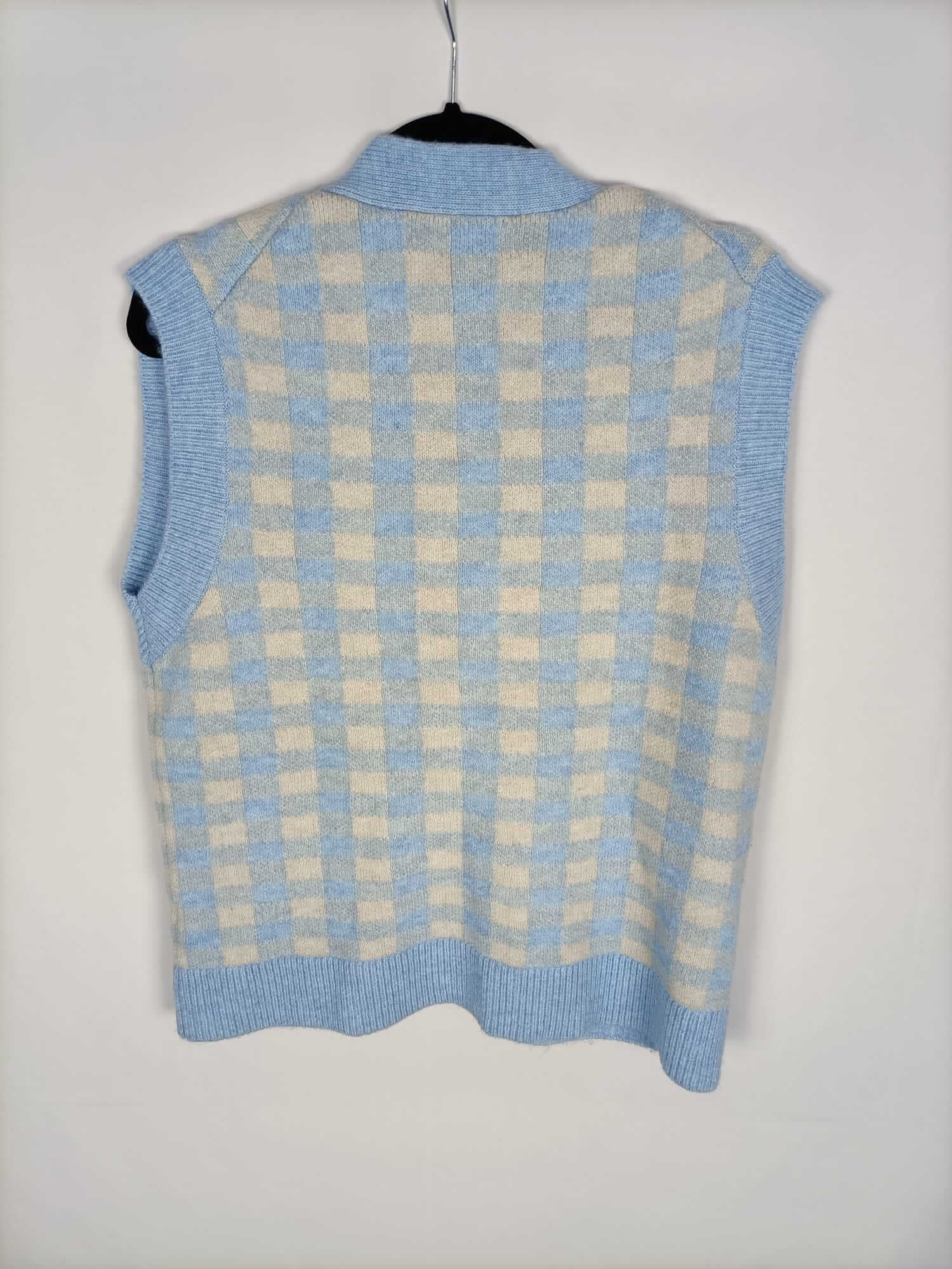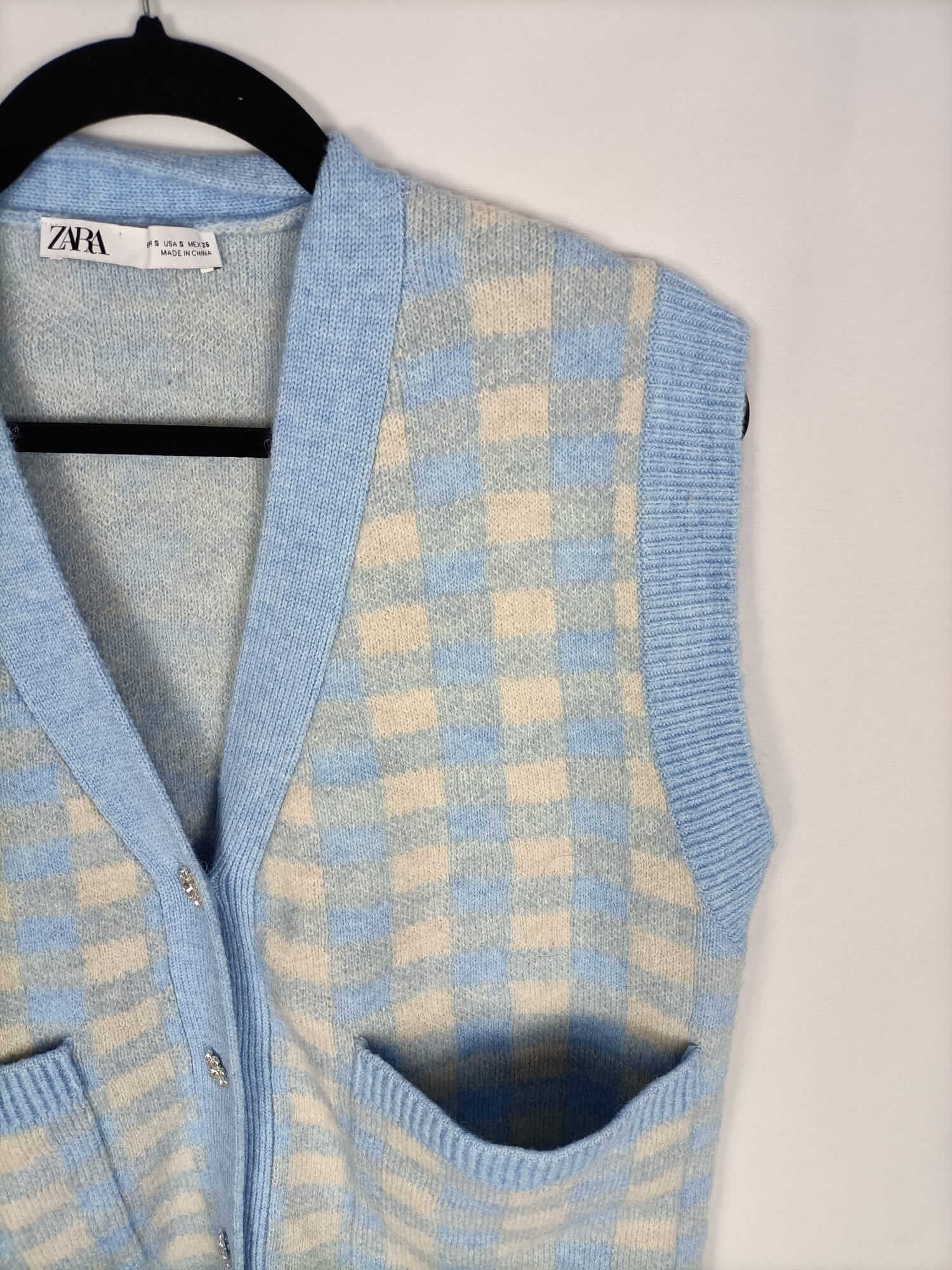 Zara. Chaleco sin mangas de cuadros beige y azul con detalle de botones de pedrería. Elástico. Largo 66 cm