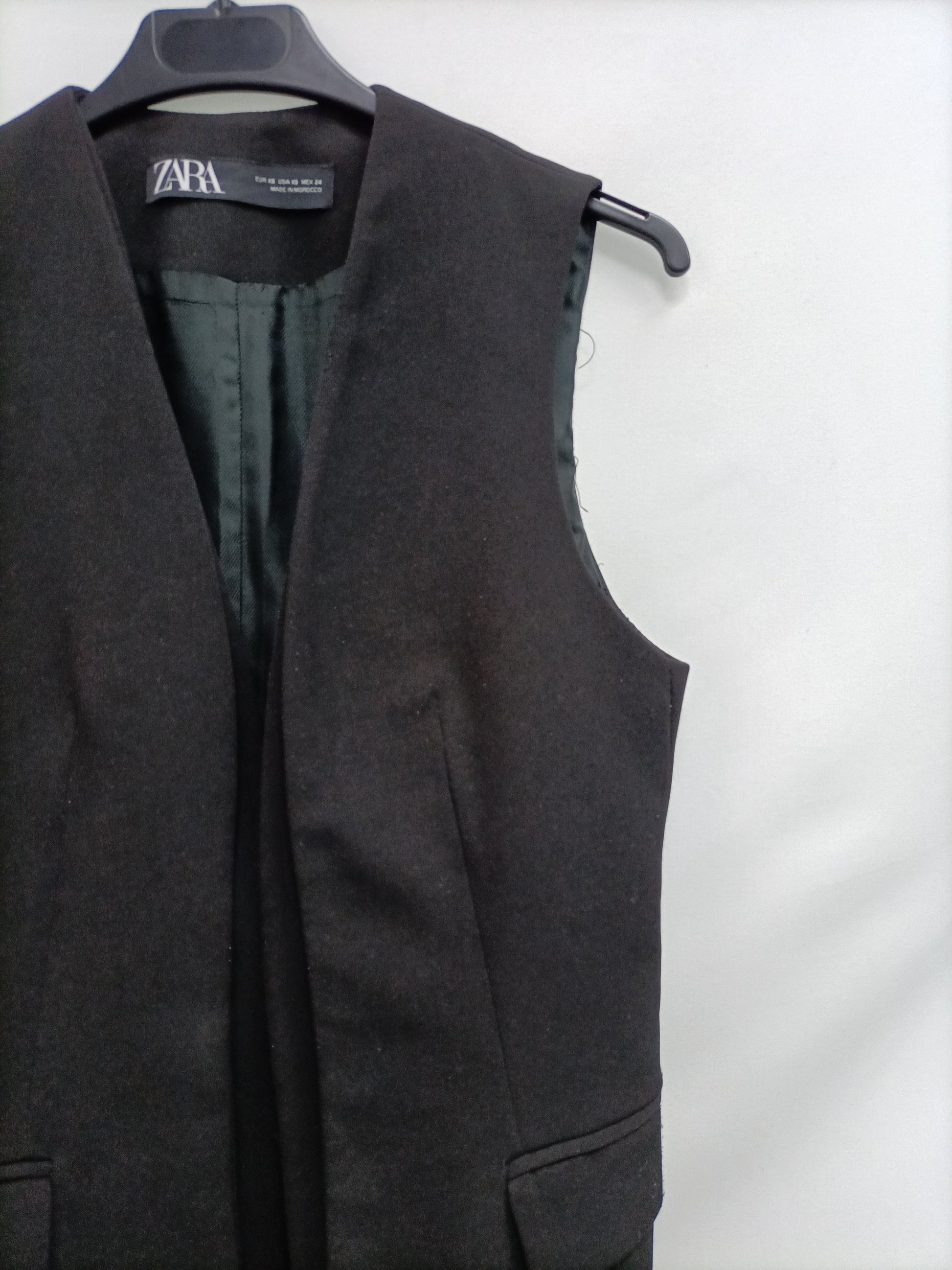 Chaleco negro abierto. No se abrocha. De sisa a sisa 42 cm Largo 66 cm