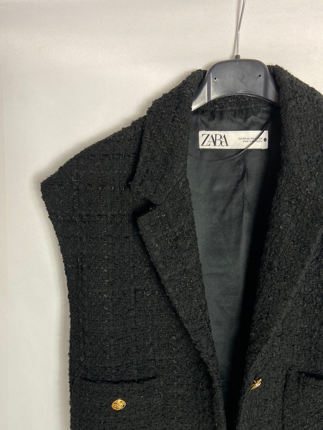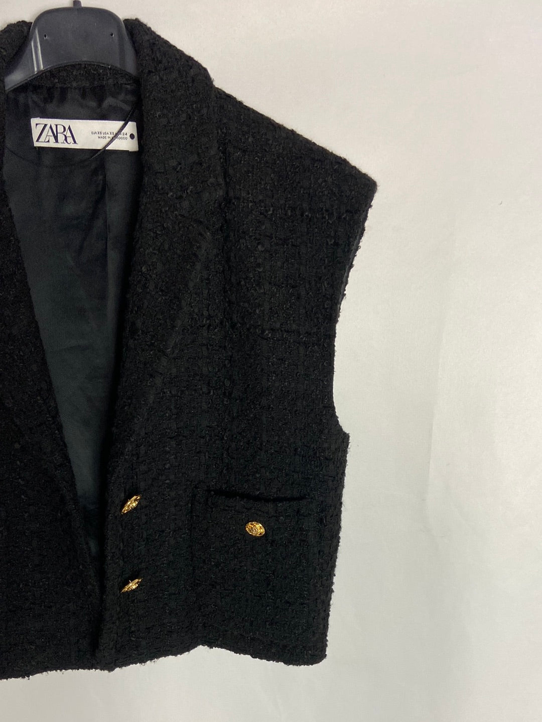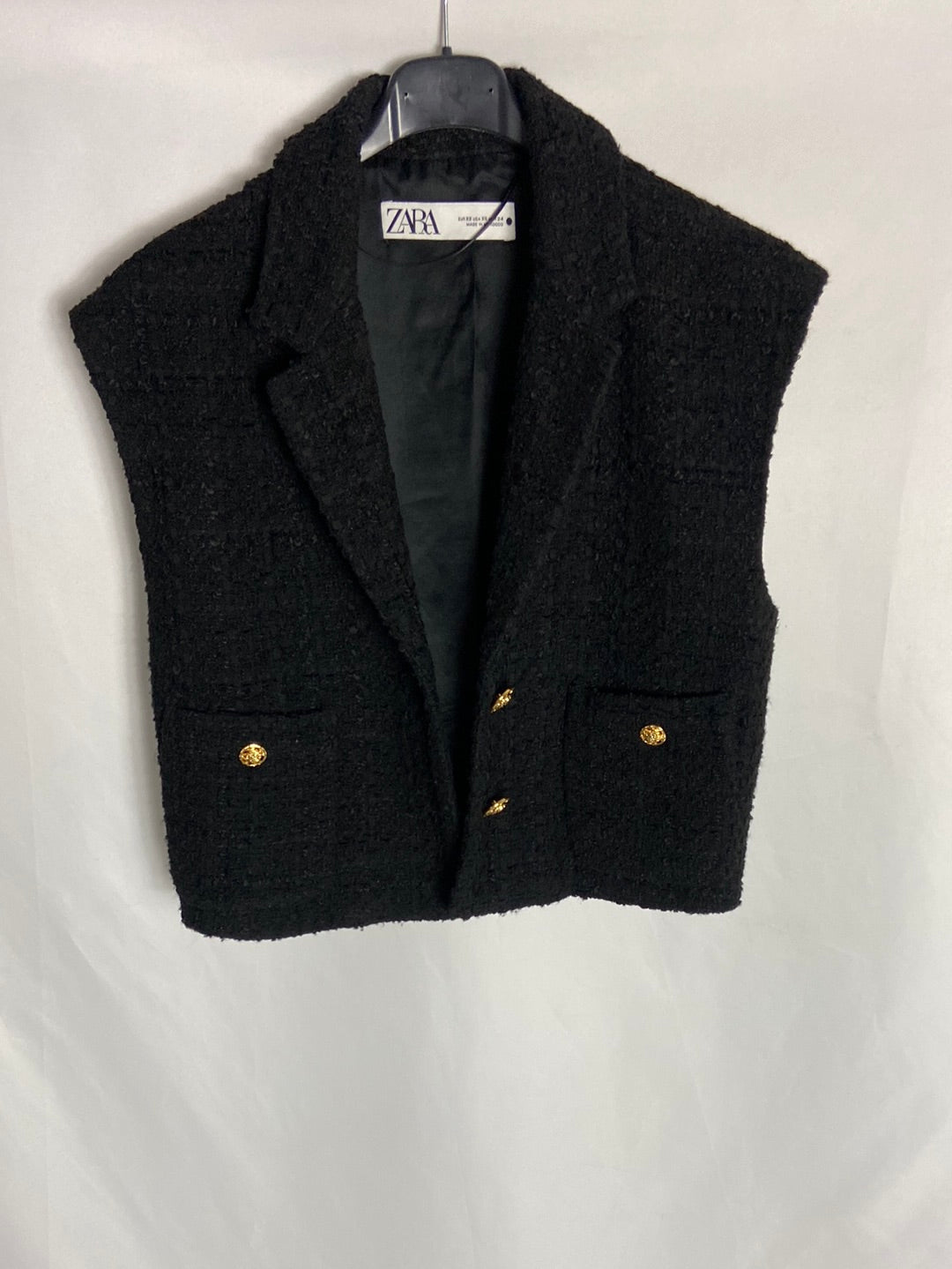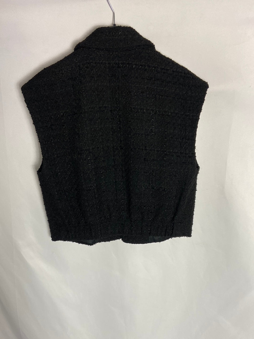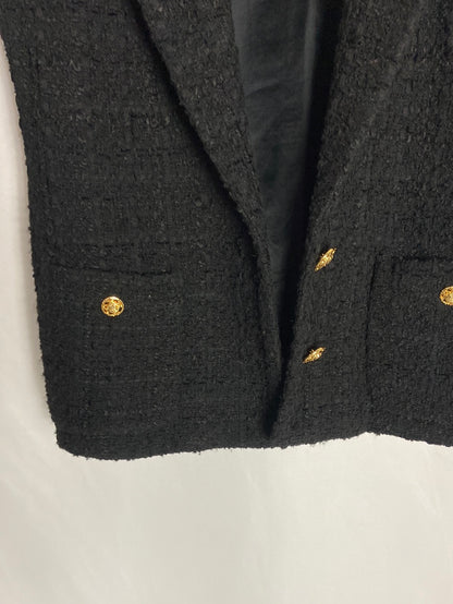 chaleco negro de tweed con botones dorados. De sisa a sisa 48 cm y largo 45 Cm