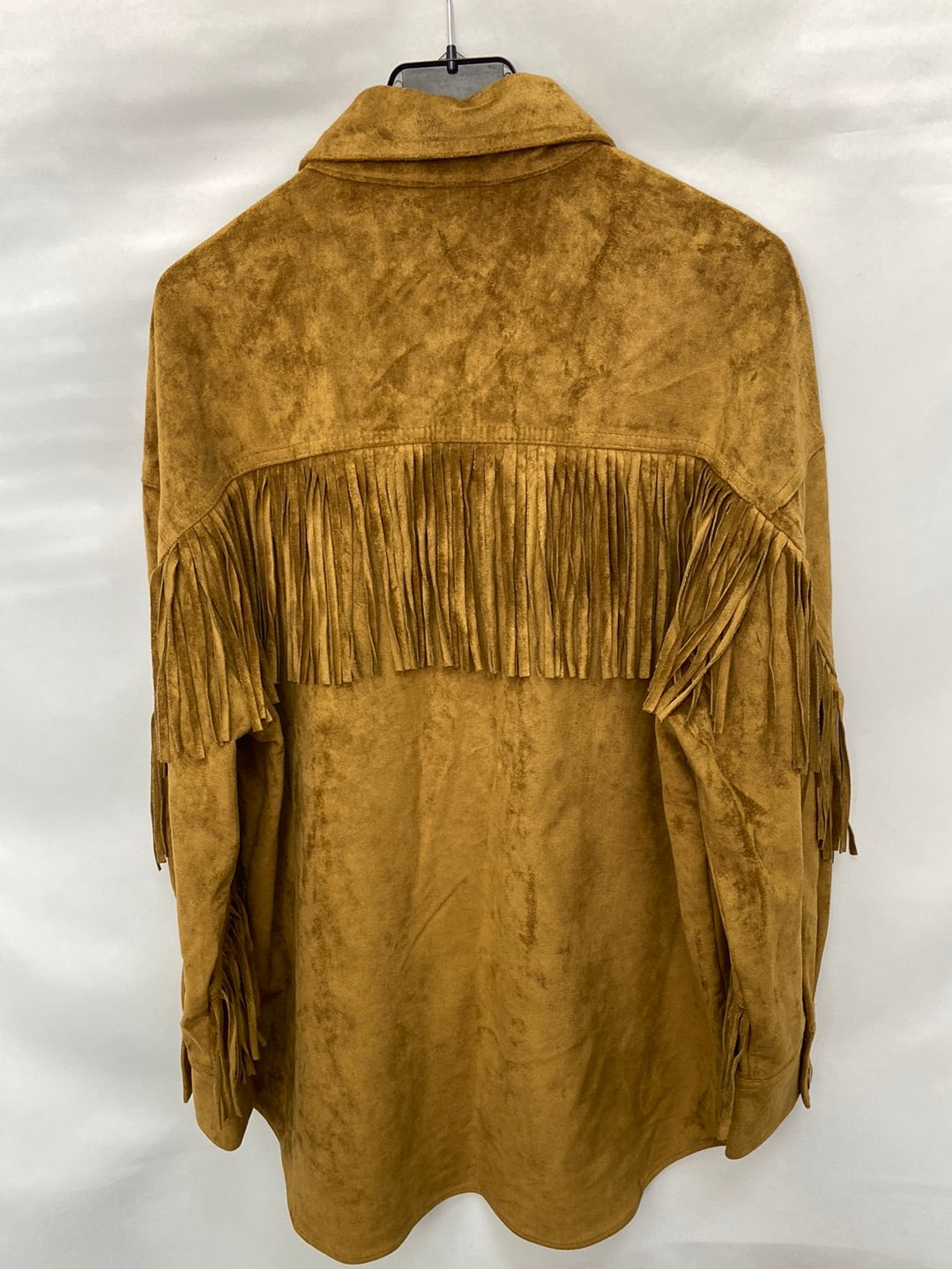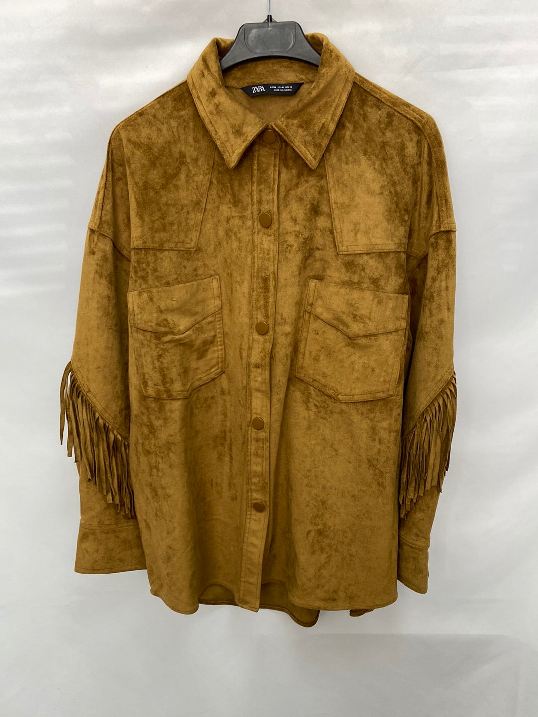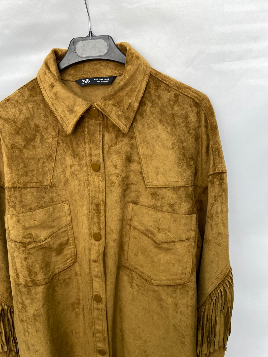 chaqueta mostaza/camel de antelina con botones del mismo tono y flecos en la espalda y mangas
