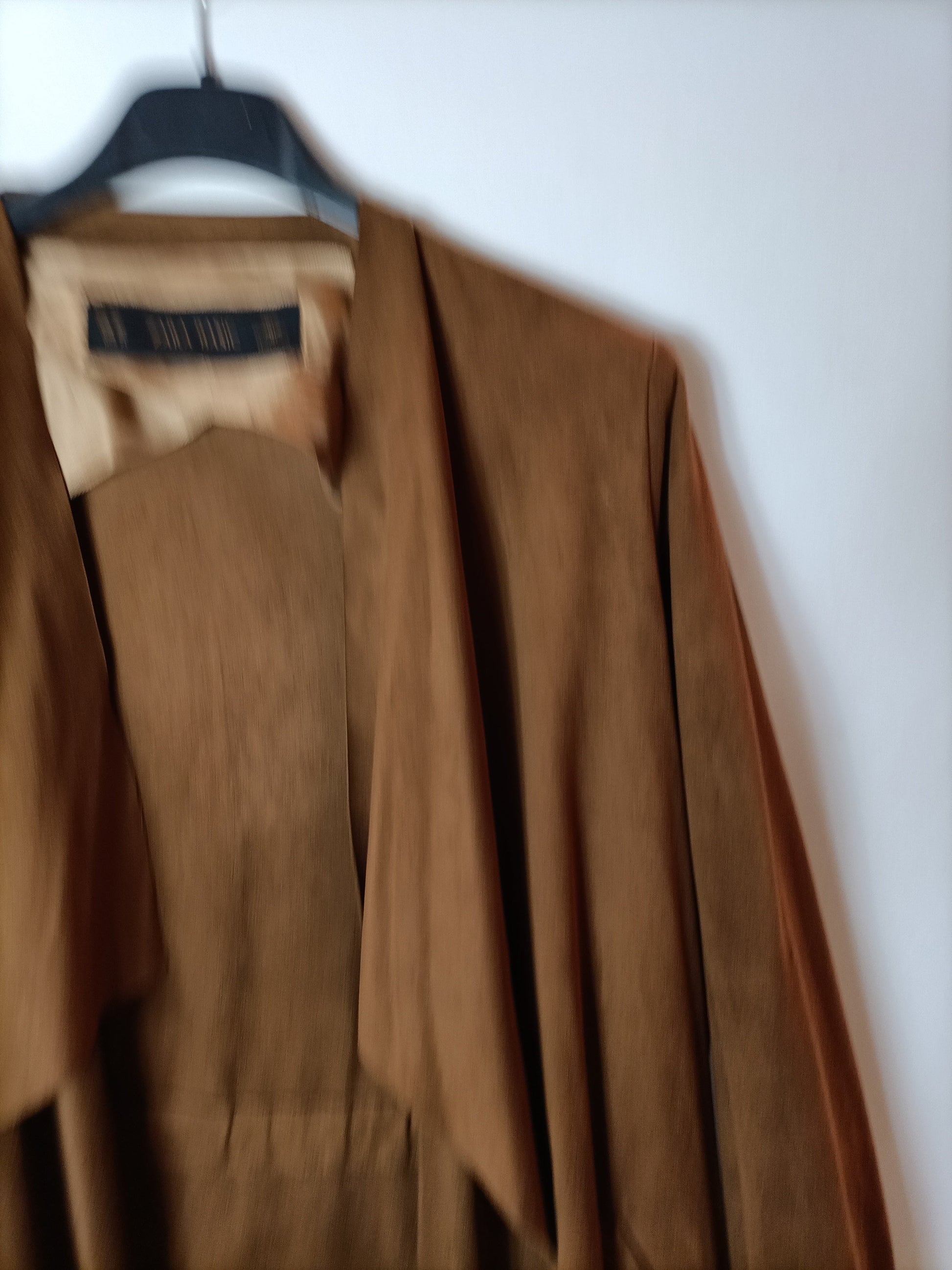 Chaqueta fina antelina con cintura ajustable. largo 62 cm .Tara: mini descosido en la costura de el cordón interior
