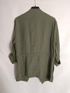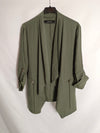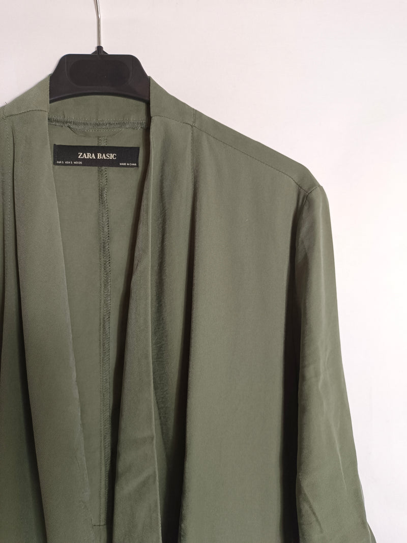 chaqueta fina verde. fluida. No se abrocha y es ajustable en la cintura