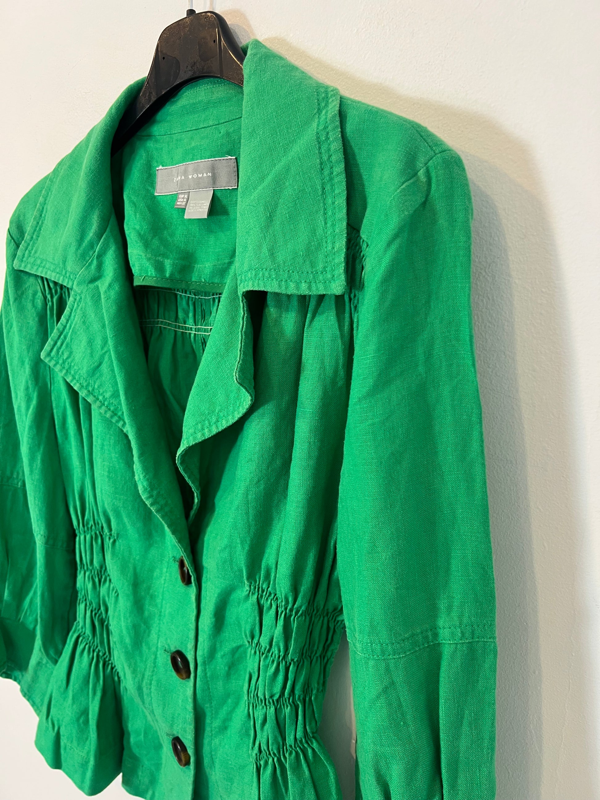 Chaqueta verde 100%lino abotonada .Hombros 40 cm, espalda 42 cm, largo 45 cm. De zara vintage. cintura elástica . Tejido con uso.