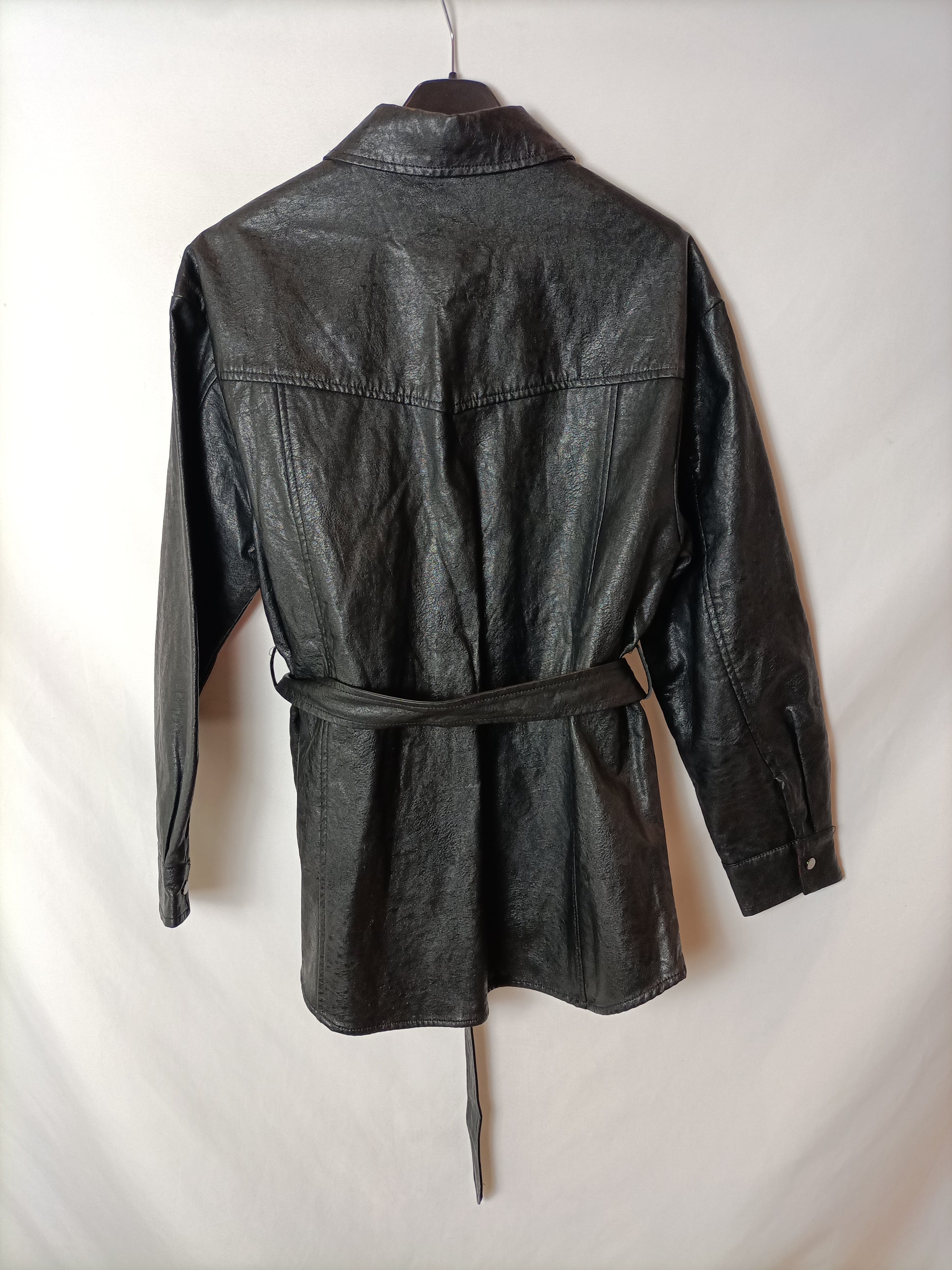 chaqueta negra efecto piel con cinturón. de sisa a sisa 50 cm largo 78 cm
