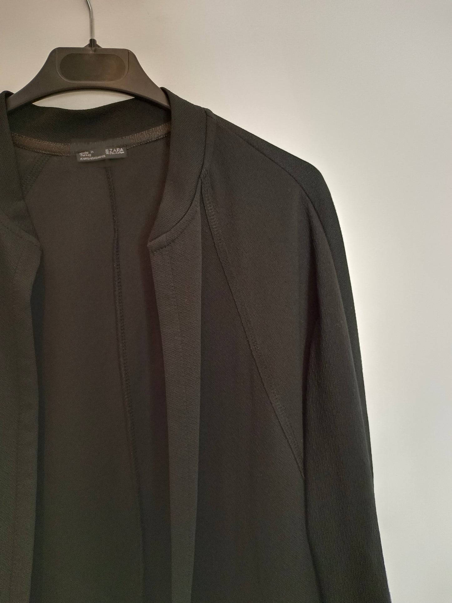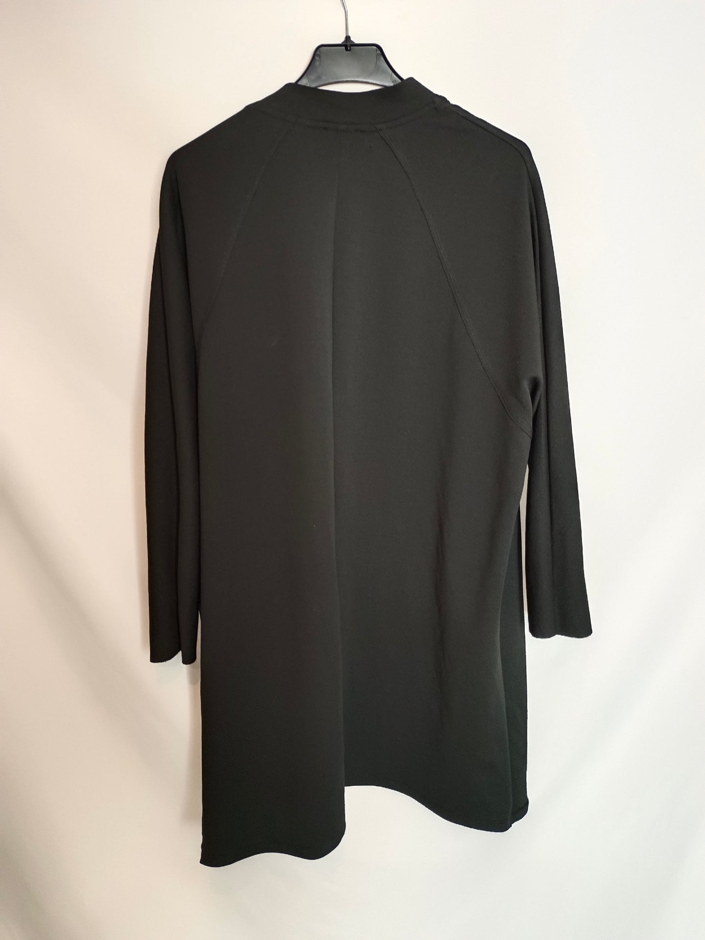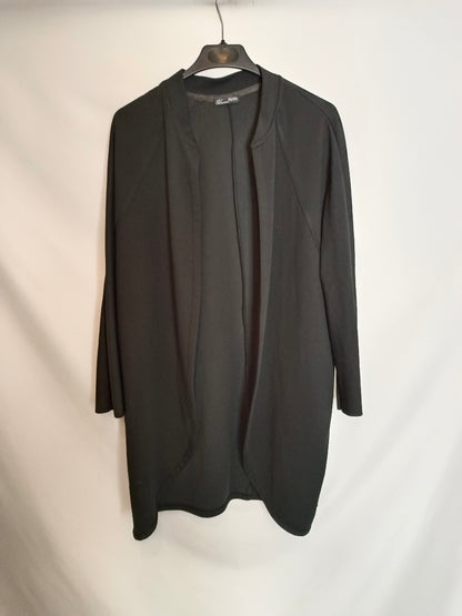 chaqueta negra de tejido elástico. no se abrocha. largo 86 cm