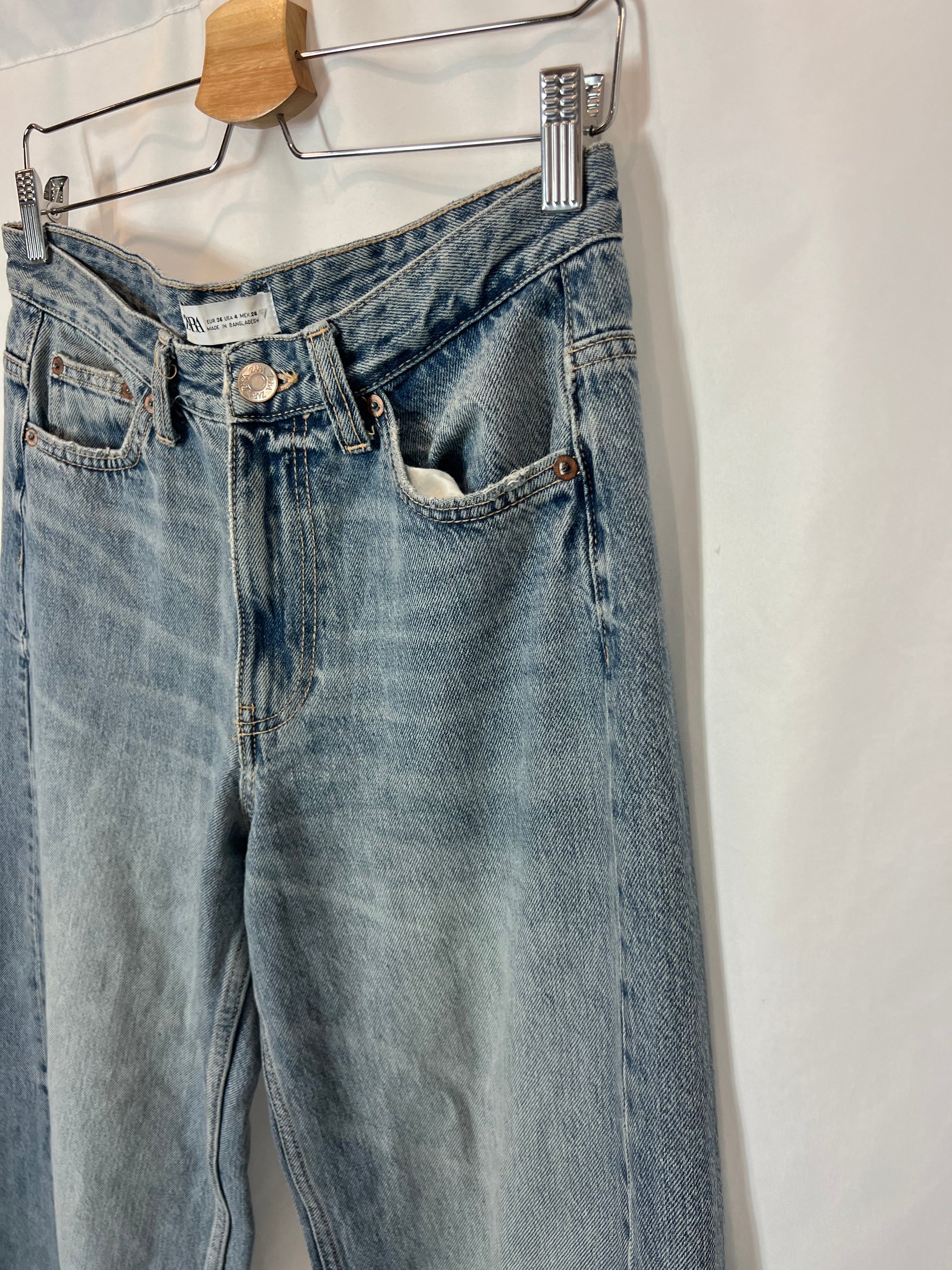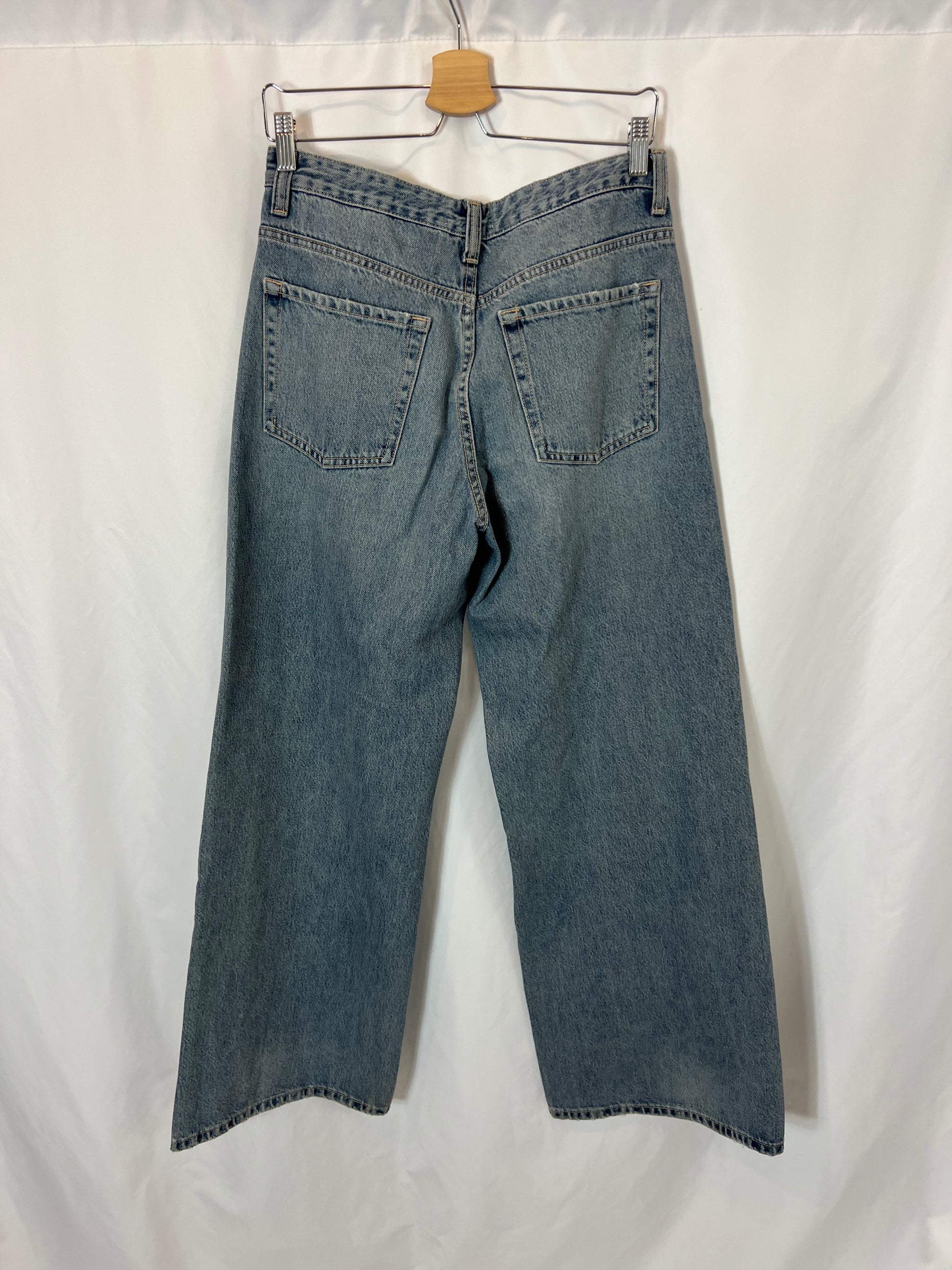 Pantalón vaquero pata ancha tono claro. cintura 39cm, largo 110cm No elástico