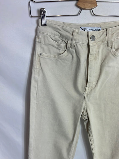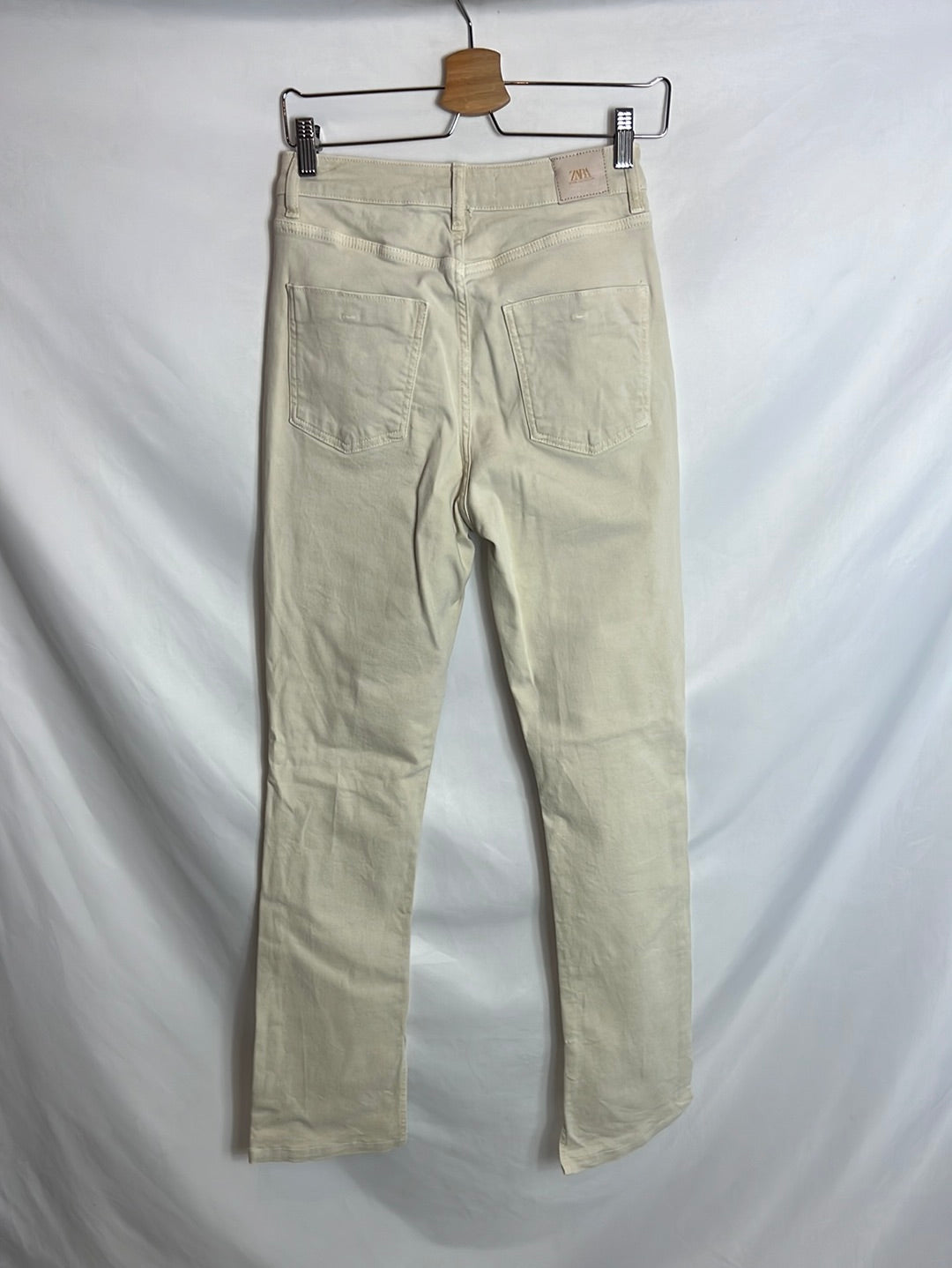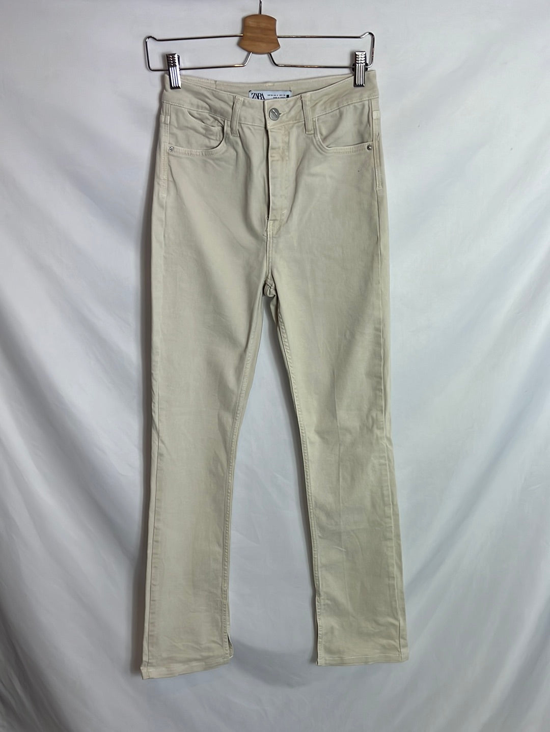 Pantalón beige ligeramente acampanado tejido denim, Cintura 34cm, largo 111cm, semi elastico