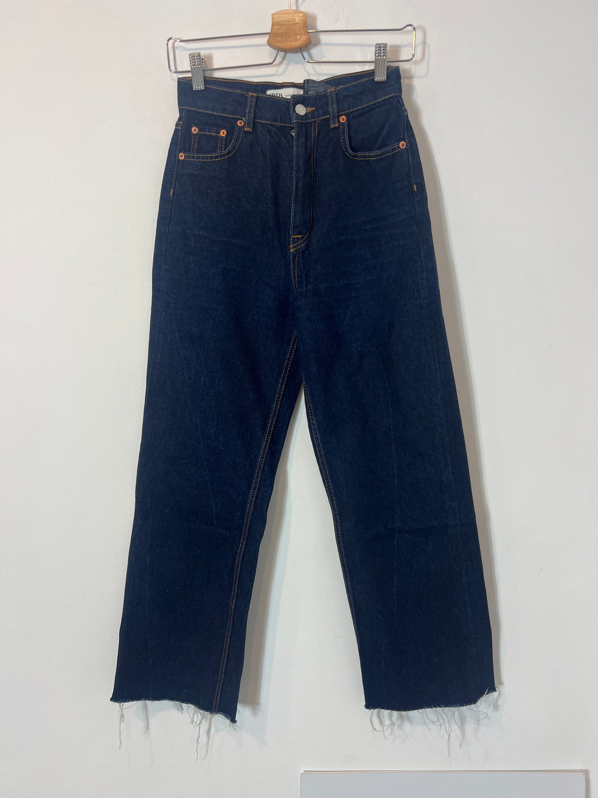 Denim recto azul oscuro .Cintura 33 cm, largo 99 cm. no elástico
