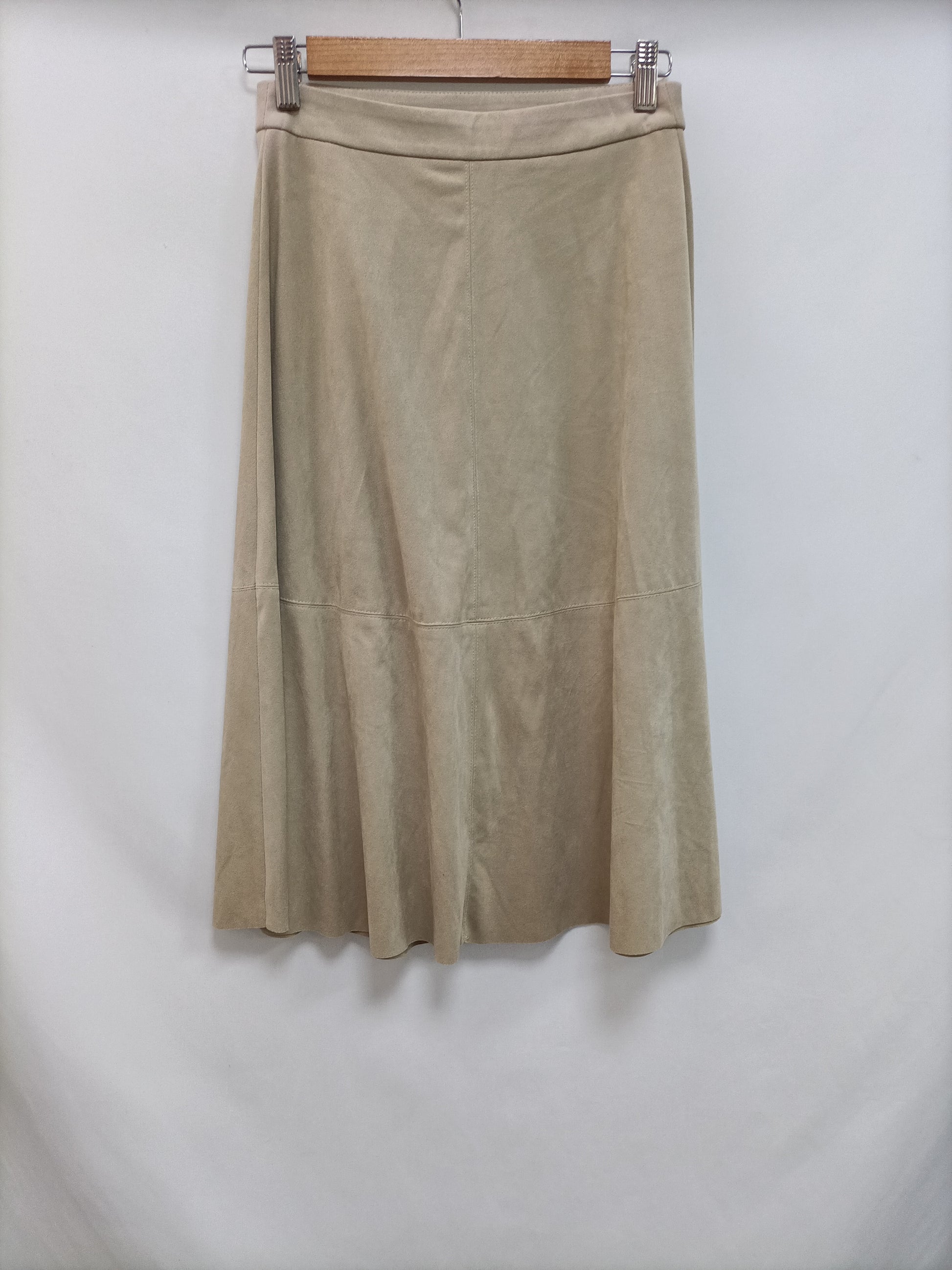 falda de antelina beige cruzada con botones. elástica. cintura 32 cm largo 68 cm