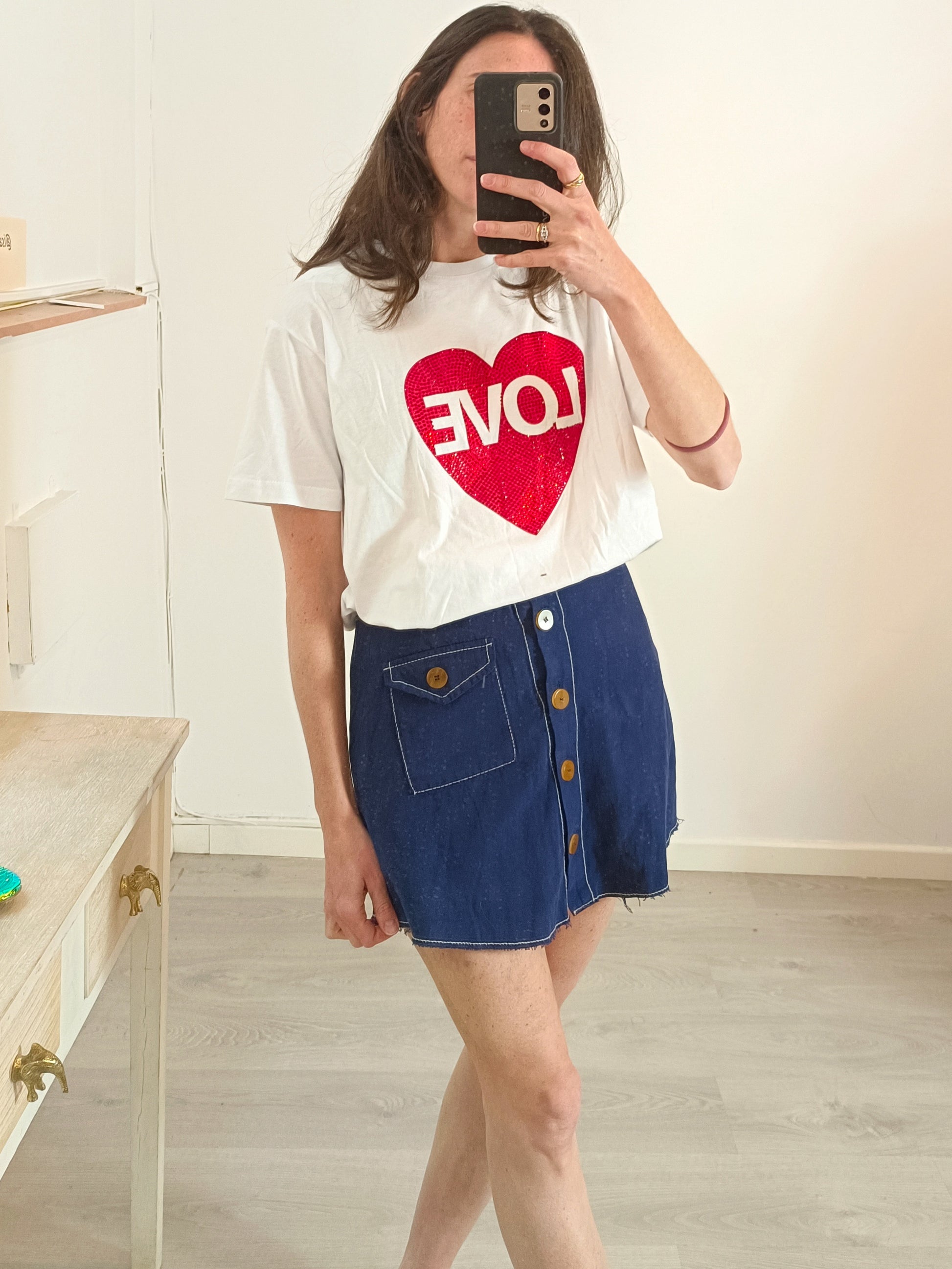 falda corta abotonada y deshilachada. cintura elástica . Cintura 31cm, largo 41cm