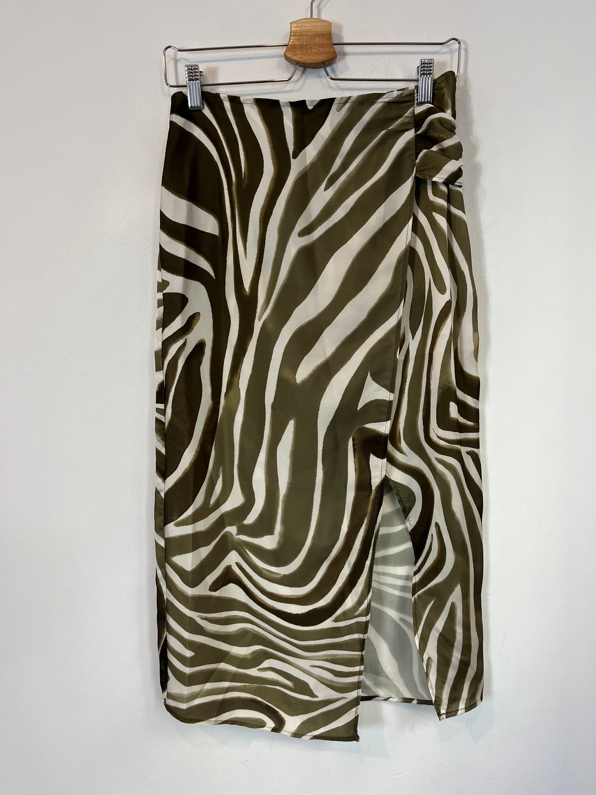Falda midi estampada tonos verdes. Abertura delantera y cruzada . Cintura 36 cm largo 80 cm