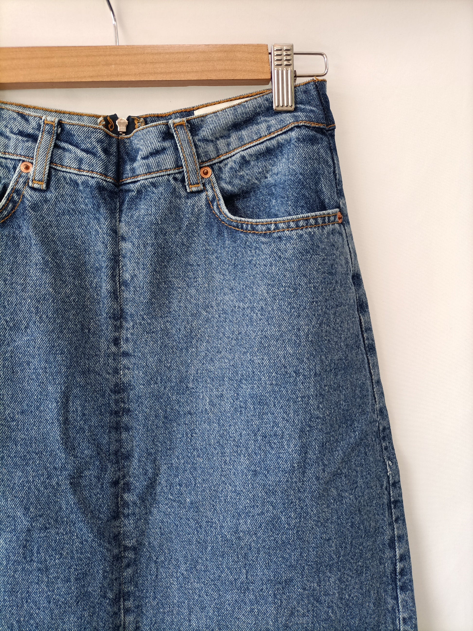 Falda larga vaquera de tejido bicolor y zonas efecto desteñido. No elástica. Cintura 34 cm largo 92 cm