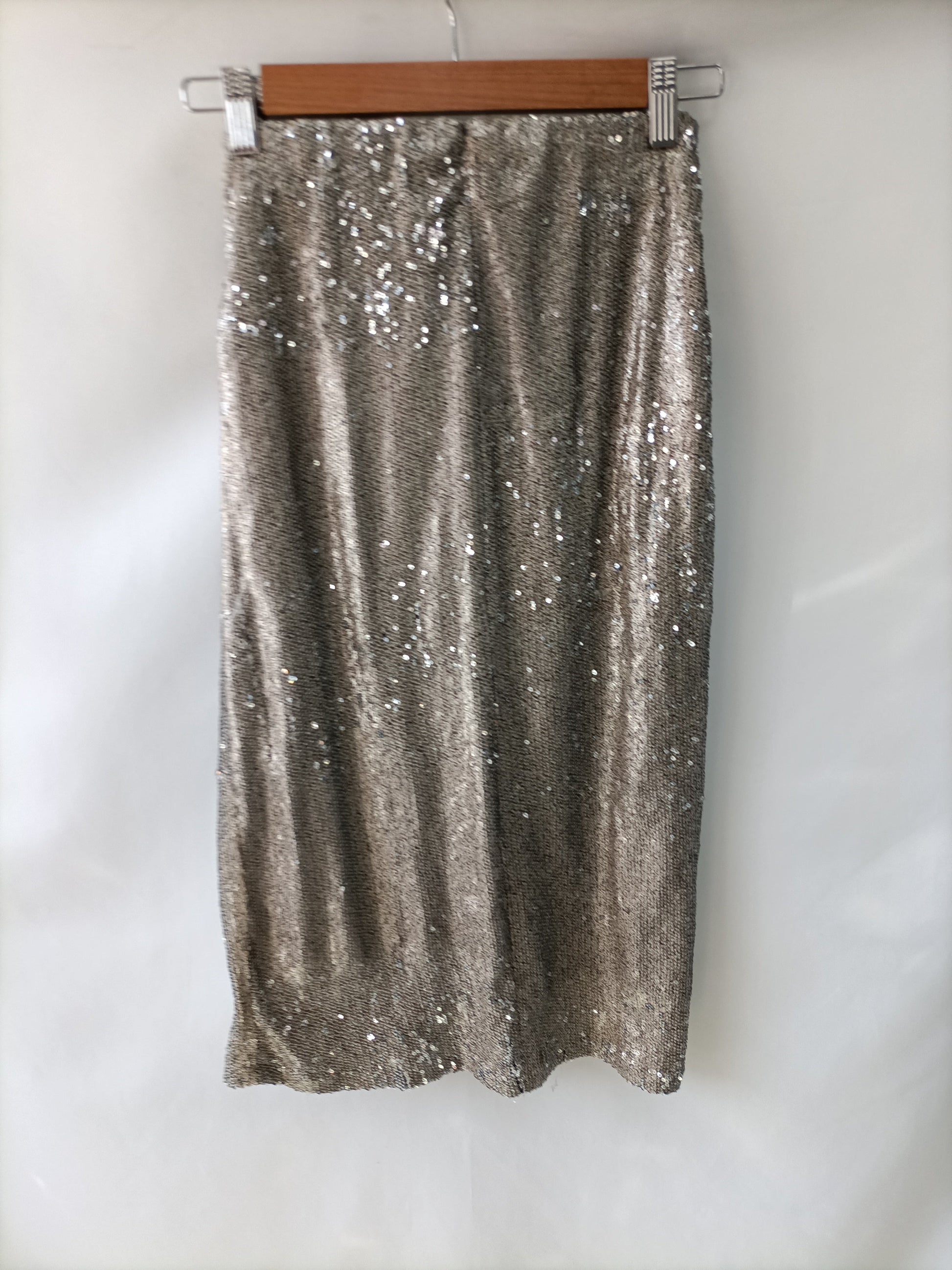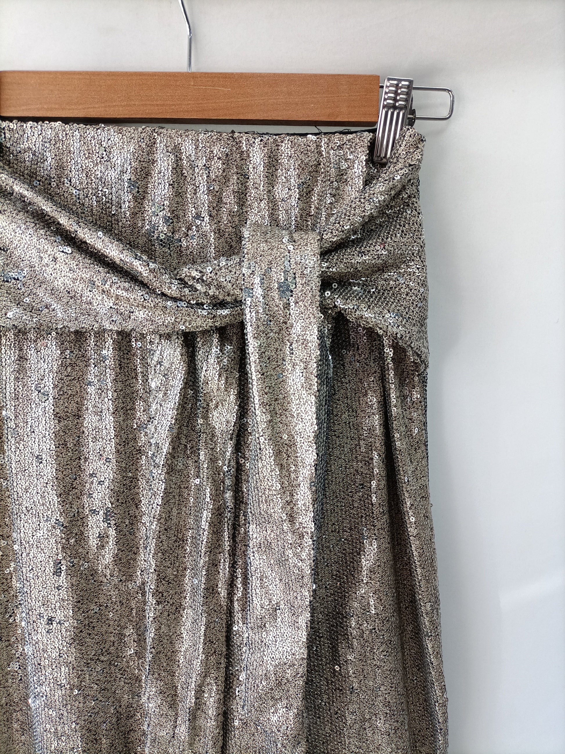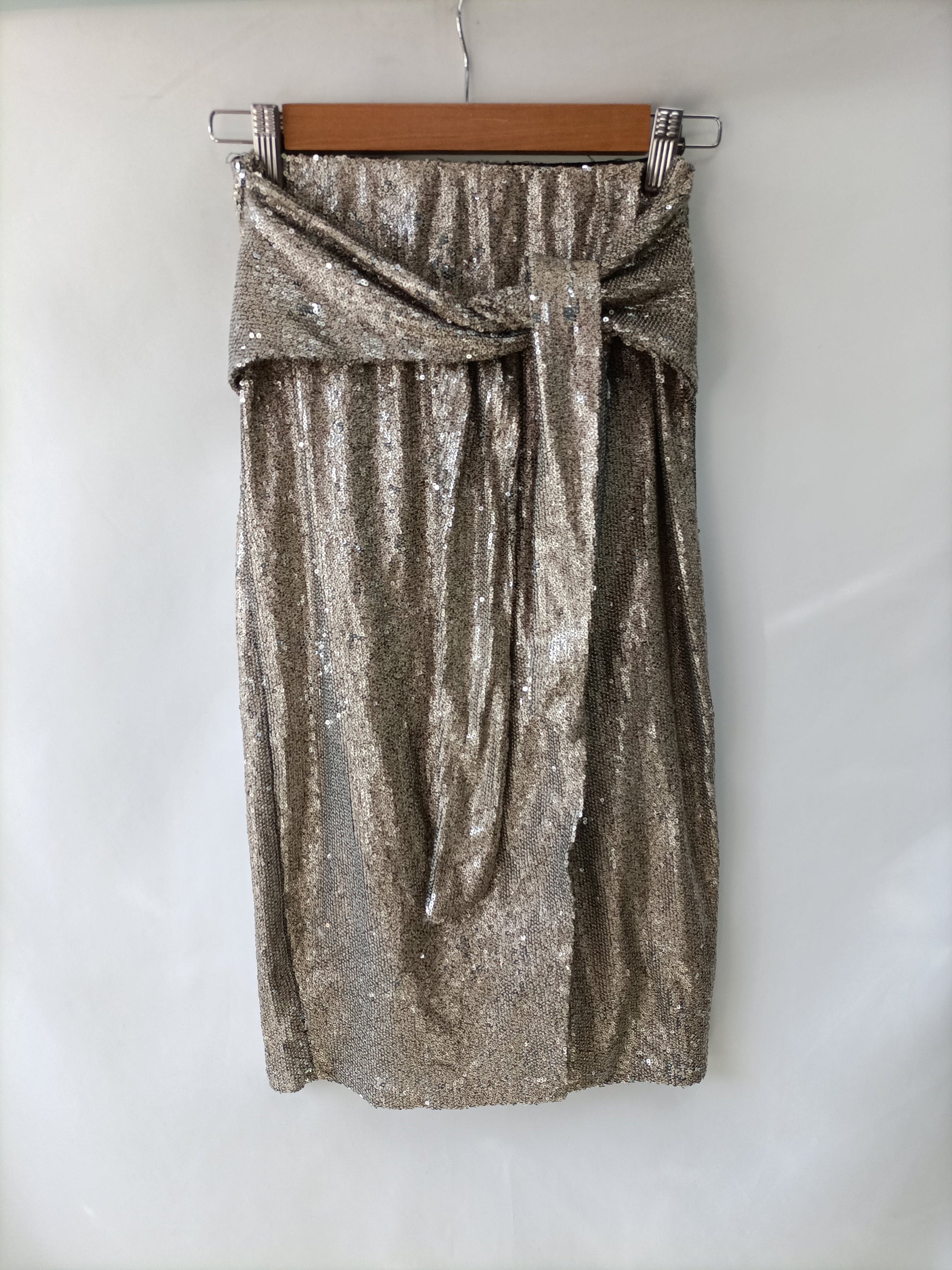 NUEVO CON ETIQUETA. Falda de lentejuelas. Eslática. Dorado/plateado. Nudo delante y apertura. Largo 67 cm