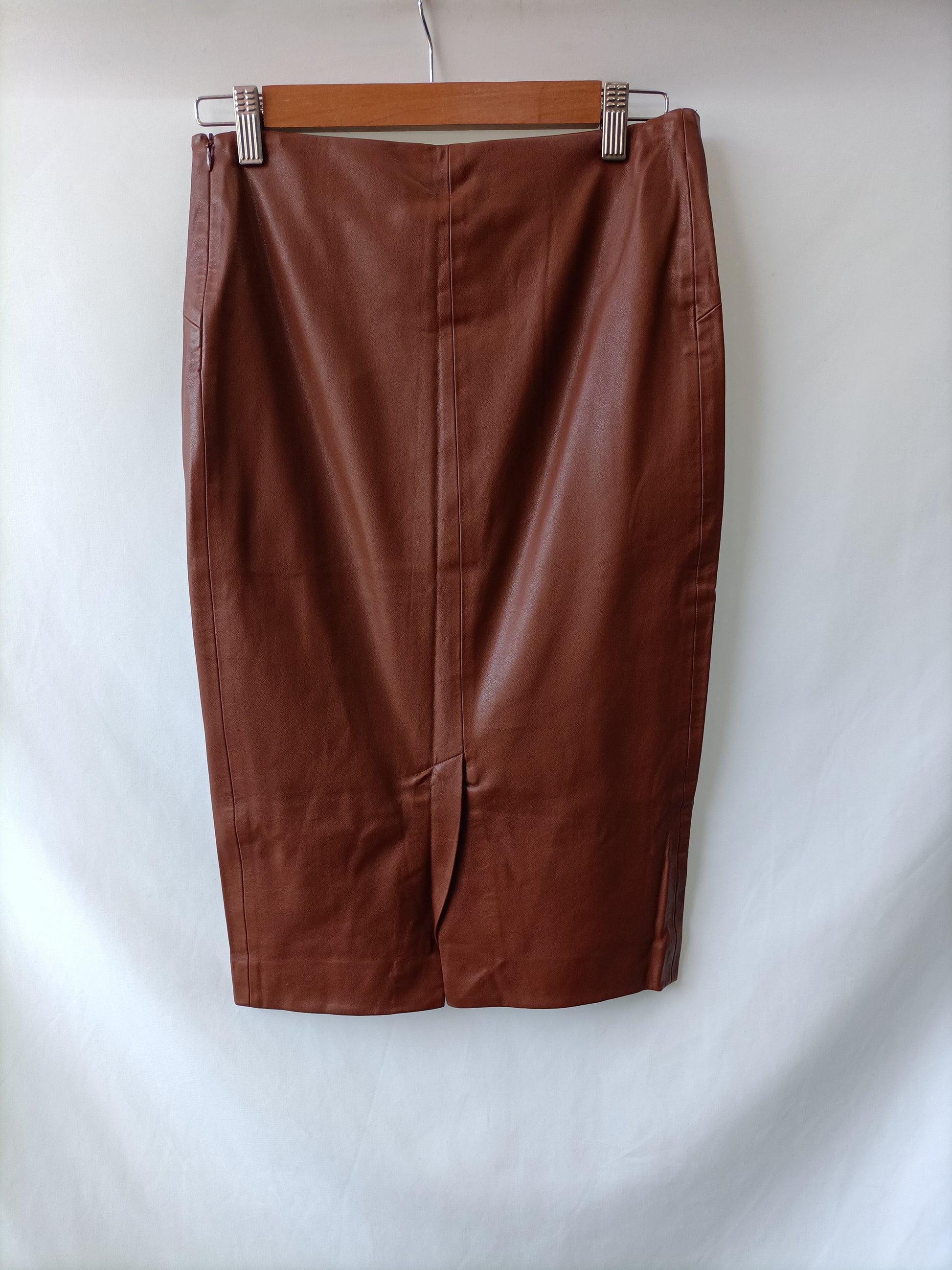 Zara. Falda marrón de polipel no elástica. Largo por la rodilla. Cintura 36 cm largo 64 cm