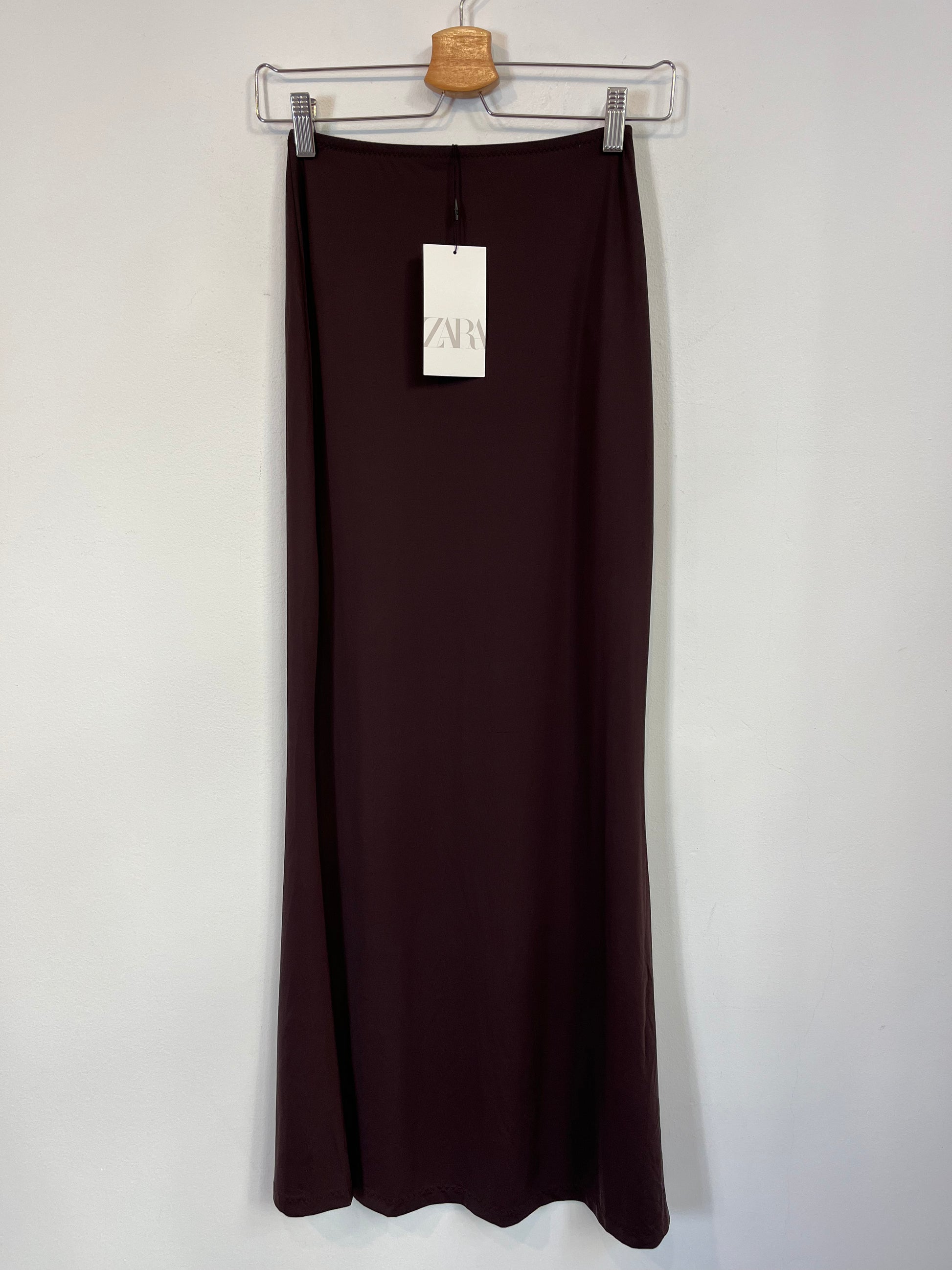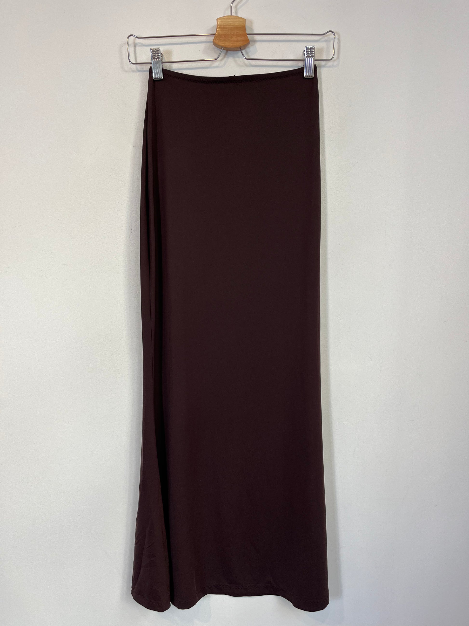 NUEVO CON ETIQUETA. Falda midi satinada marrón elástica. Cintura 32 cm largo 101 cm